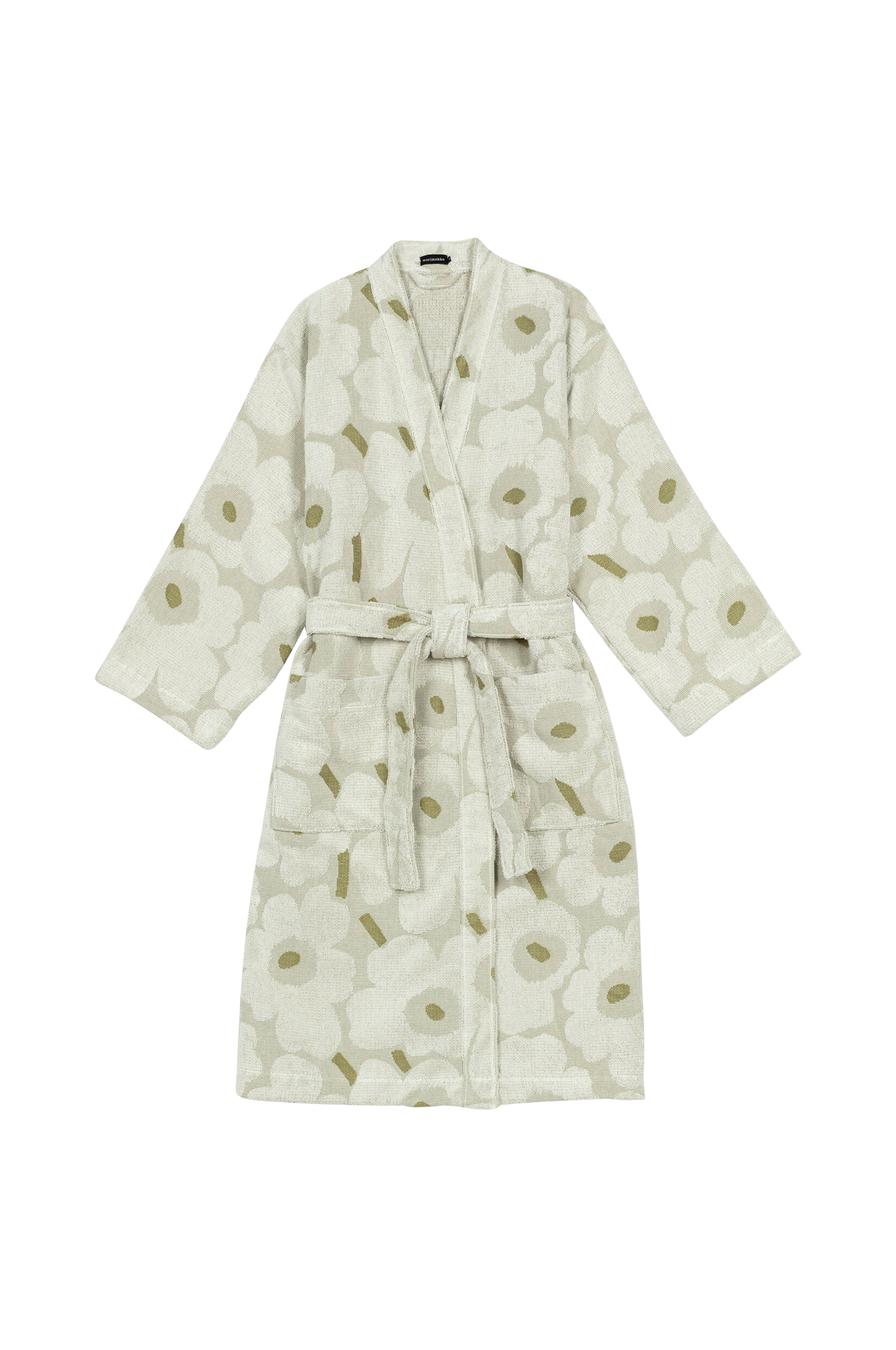 Tätä puuvillaista froteekylpytakkia koristaa Pieni Unikko -kuvio. Kylpytakissa on suuret taskut edessä ja irrotettava vyö. Tämä tuote on luomupuuvillaa. Marimekon kuuluisa kuvio Unikko syntyi vuonna 1964 aikana, jolloin suunnittelutalon mallistoissa oli enimmäkseen abstrakteja kuoseja. Suunnittelija Maija Isola halusi luoda tästä orgaanisesta teemasta jotain mielenkiintoista ja suunnitteli kokonaisen sarjan kukkakuvioita. Nykyään ikoninen kukka edustaa luovuutta.