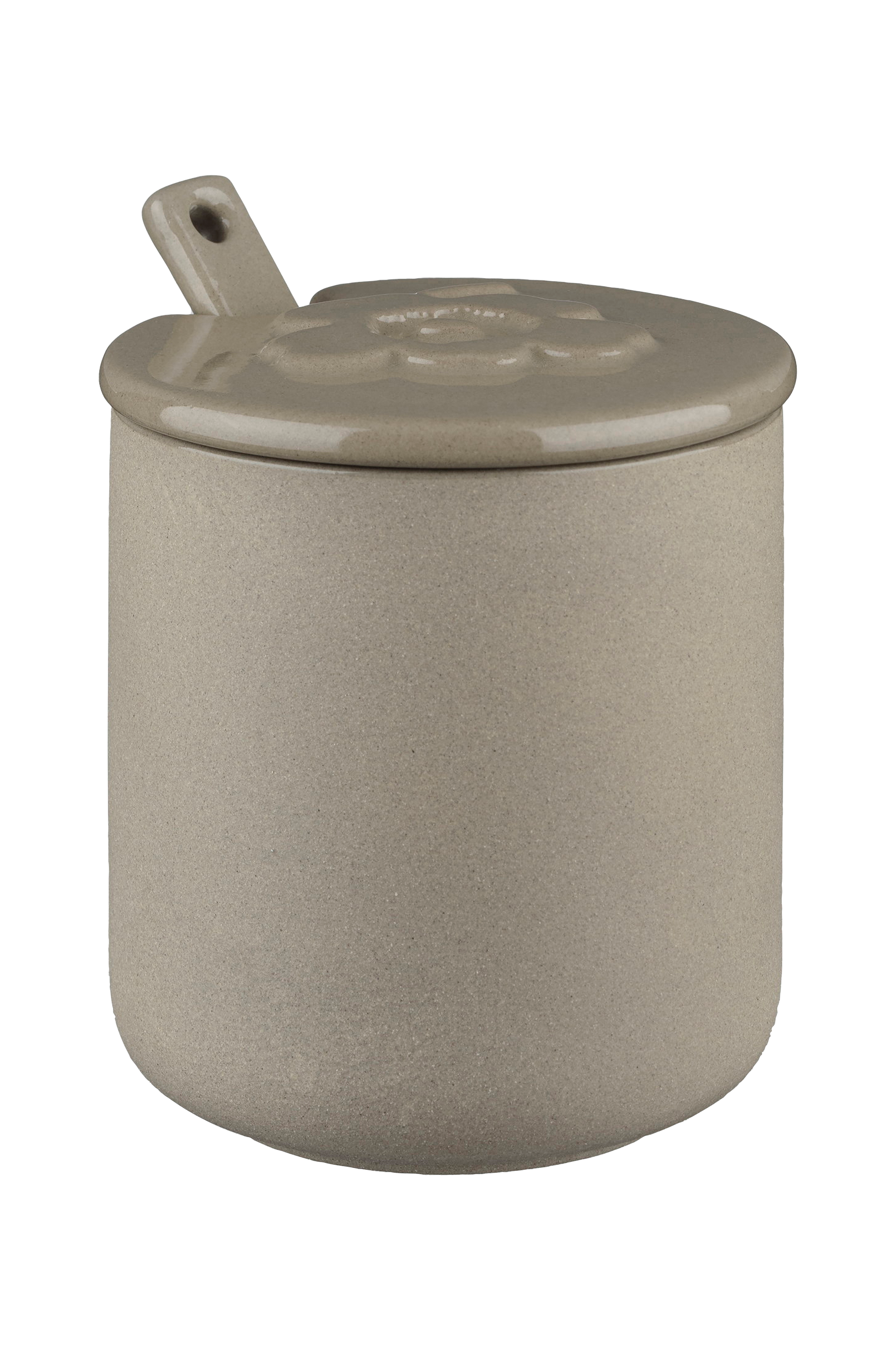 Maustepurkki ruskeaa kivitavaraa. Purkin ulkopuoli on jätetty luonnollisen karheaksi kun taas sisäpuolella, kannessa ja lusikassa on läpikuultava lasite. Kannessa on pintakuvioitu Unikko-kuvio ja reikä pienelle keramiikkalusikalle. Kestävät konepesun. Tuote toimitetaan lahjapakkauksessa. Marimekon kuuluisa Unikko-kuvio luotiin vuonna 1964, jolloin valikoimissa suosittiin paljon abstrakteja kuvioita. Muotoilija Maija Isola halusi luoda tästä teemasta jotakin uudenlaista ja kiinnostavaa, ja suunnitteli kokonaisen sarjan vahvoja kukkakuoseja. Nykyään ikoninen kukkakuvio symbolisoi luovuutta. Poista tuotetarra pohjasta ennen käyttöä. Tarra sisältää pienen määrän metallia.