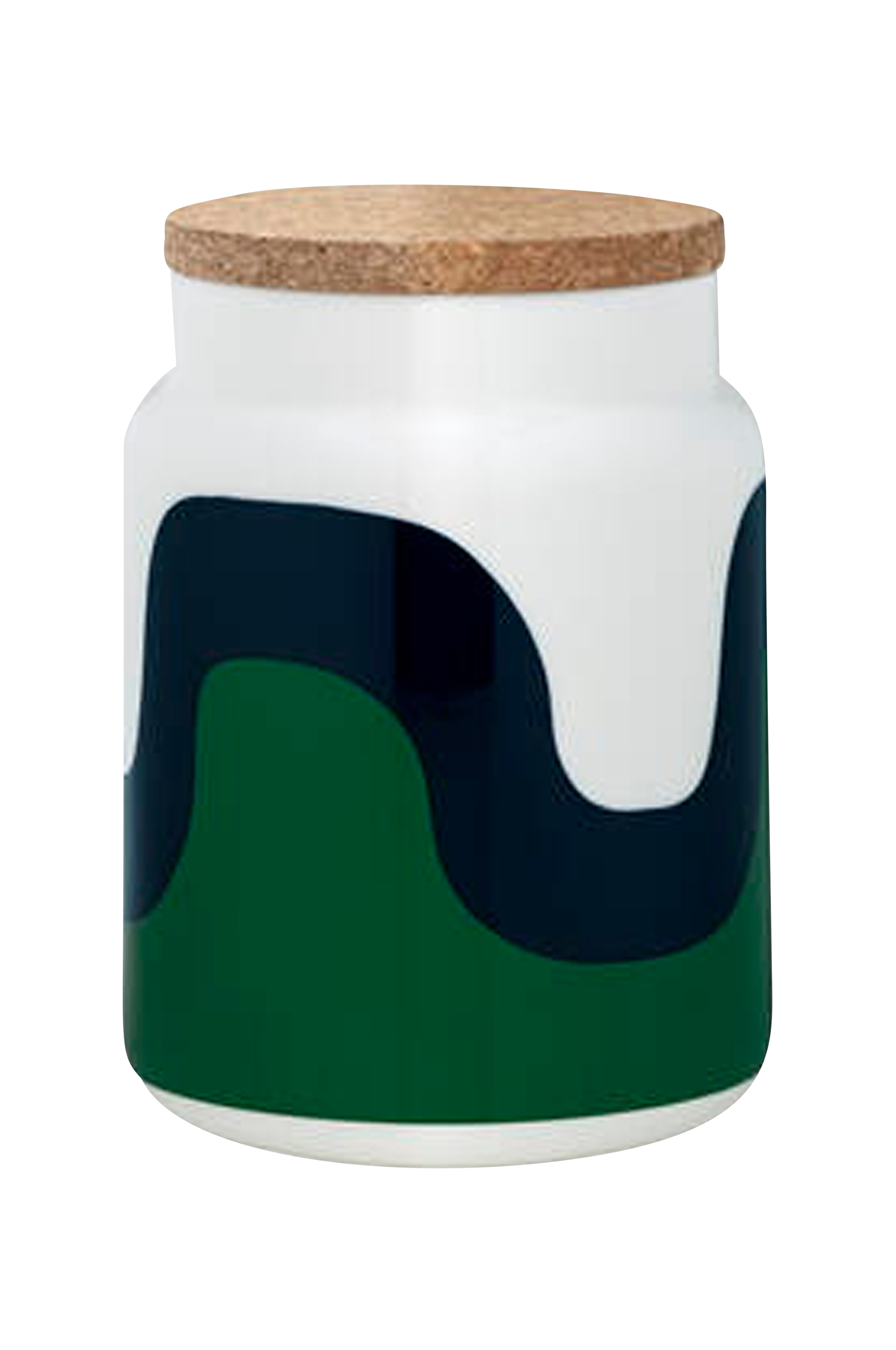 Korkea Seireeni-purkki on valkoista kivitavaraa. Purkin korkkikannen sisäpuolella on Marimekko-logo. Suosittelemme pesemään kannen käsin. Matkustaessaan Kreikkaan 1960-luvun alussa Maija Isola sai inspiraatiota veden liikkeestä ja kuvasi sitä useassa kuosissa, kuten vuodelta 1964 olevassa Seireenissä. Kuviosta voi hyvin aistia myös kreikkalaisesta mytologiasta tuttujen seireenien hurmaavan, merimiehiä tuhoon houkuttelevan laulun.