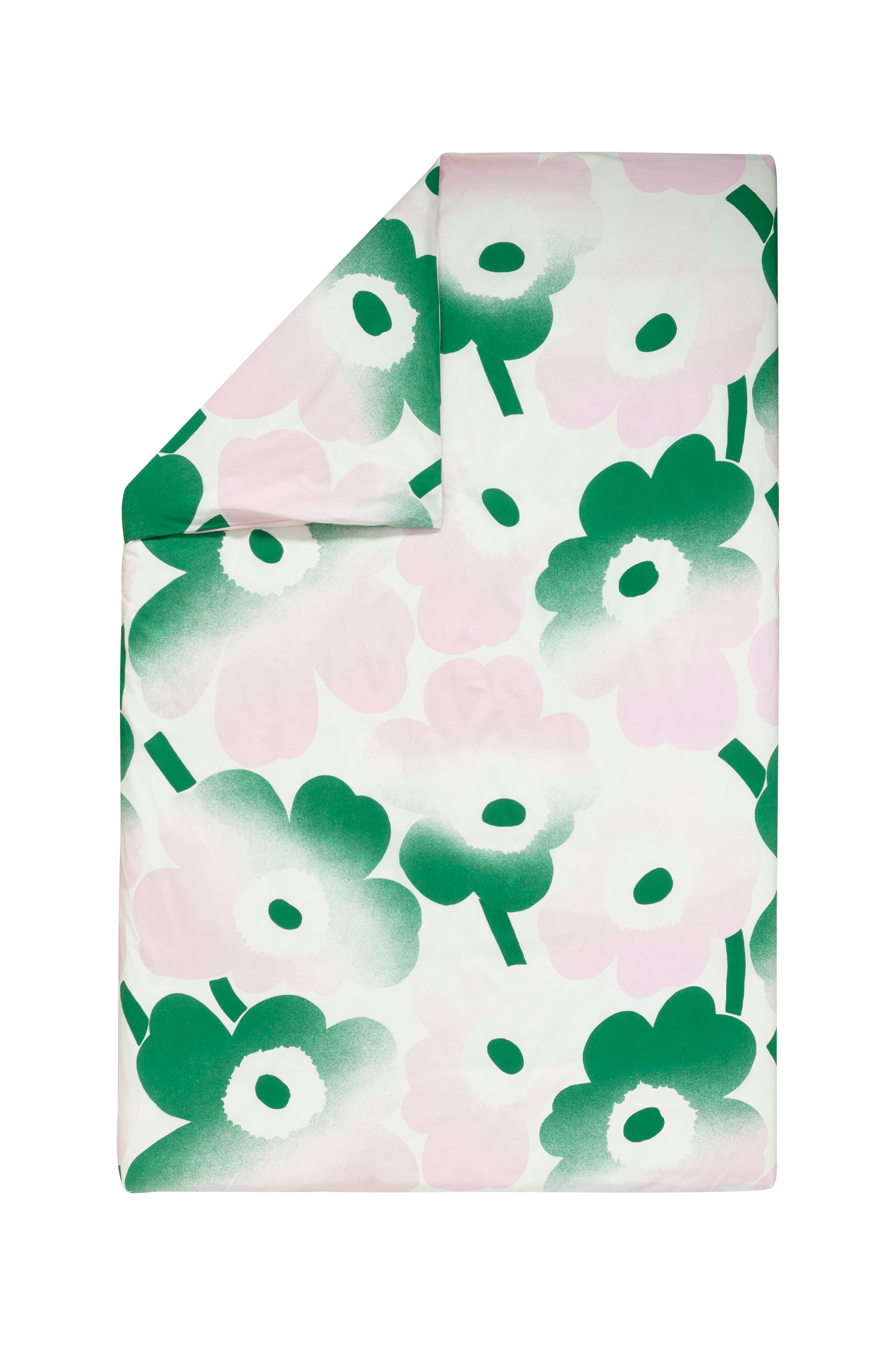 Unikko Häivähdys -kuvioinen pussilakanasetti on valmistettu 200 Tc luomupuuvillaisesta perkaalista. Yläkulmissa olevat käsiaukot helpottavat peiton vaihtamista. Marimekon kuuluisa kuvio Unikko syntyi vuonna 1964 aikana, jolloin suunnittelutalon mallistoissa oli lähinnä abstrakteja kuoseja. Suunnittelija Maija Isola halusi luoda tästä orgaanisesta teemasta jotain mielenkiintoista ja suunnitteli kokonaisen sarjan kukkakuvioita. Nykyään ikoninen kukka edustaa luovuutta.