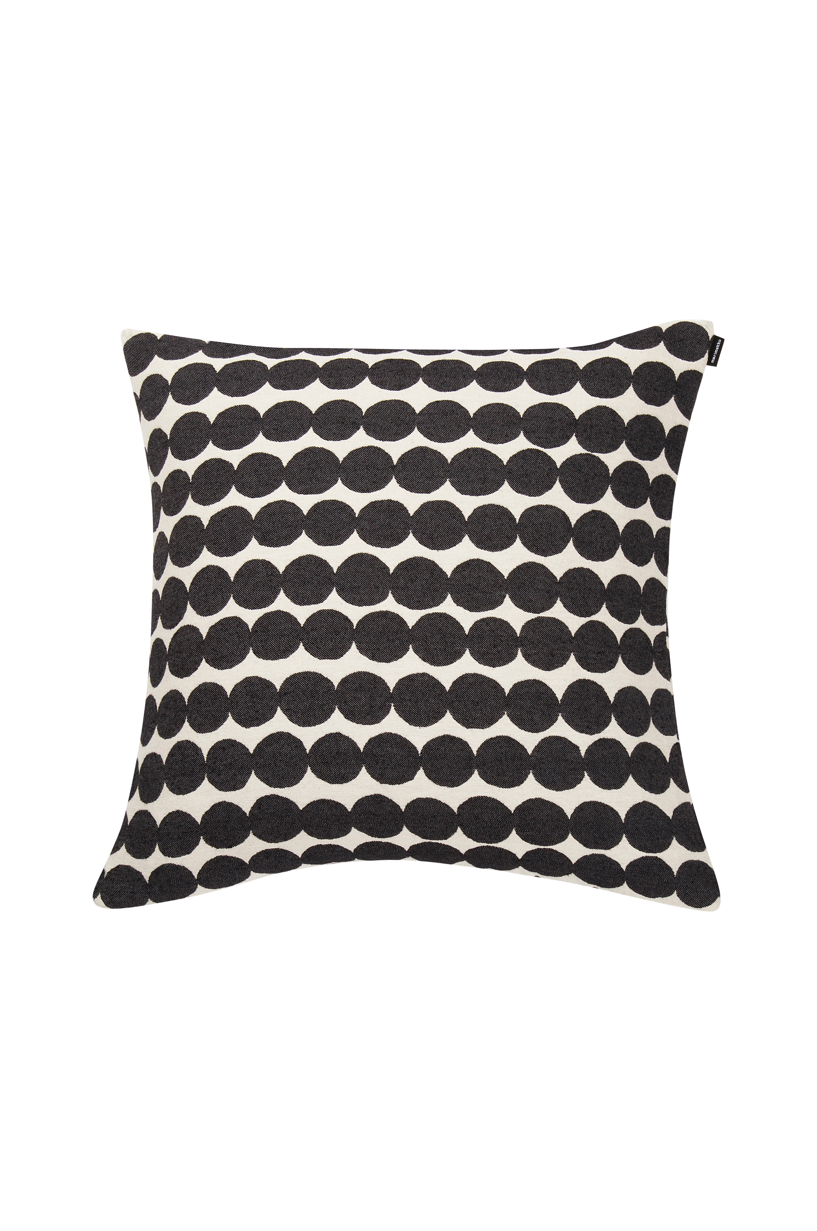 Neliönmallinen tyynynpäällinen, jossa mustavalkoinen Räsymatto-kuosi. Puuvillaa ja polyesteriä.
