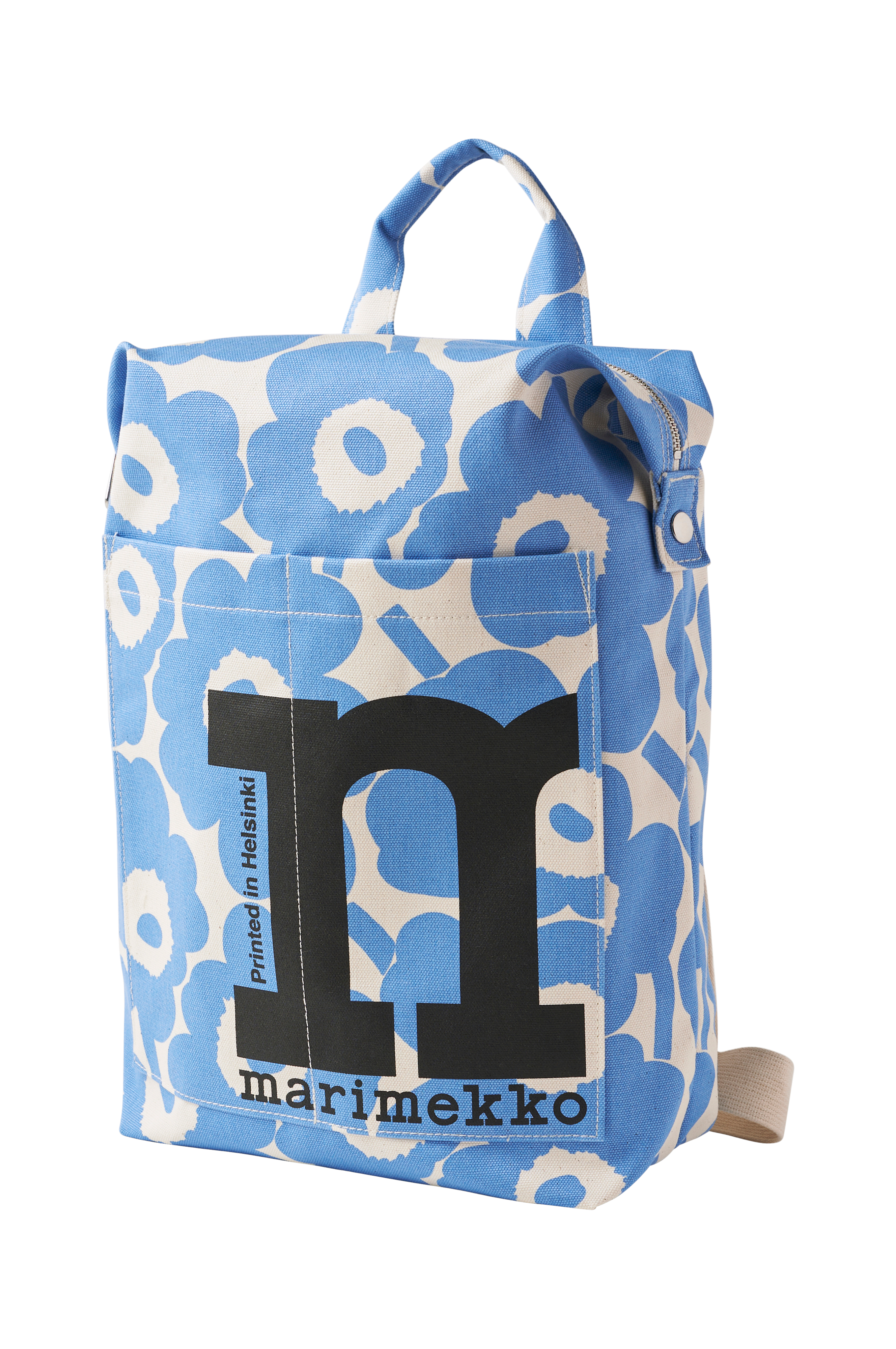 Reppu valkaisematonta ekologista puuvillaa, jossa painettu Unikko-kuvio. Repussa on vetoketju, säädettävät olkahihnat ja kaksi avotaskua edessä. Sisäpuolella iso avotasku, joka on riittävän suuri kannettavalle tietokoneelle. Vetoketjun päät voi kiinnittää laukun sivuille painonapeilla. Mitat: L 38,5 x K 47,5 x S 14 cm.