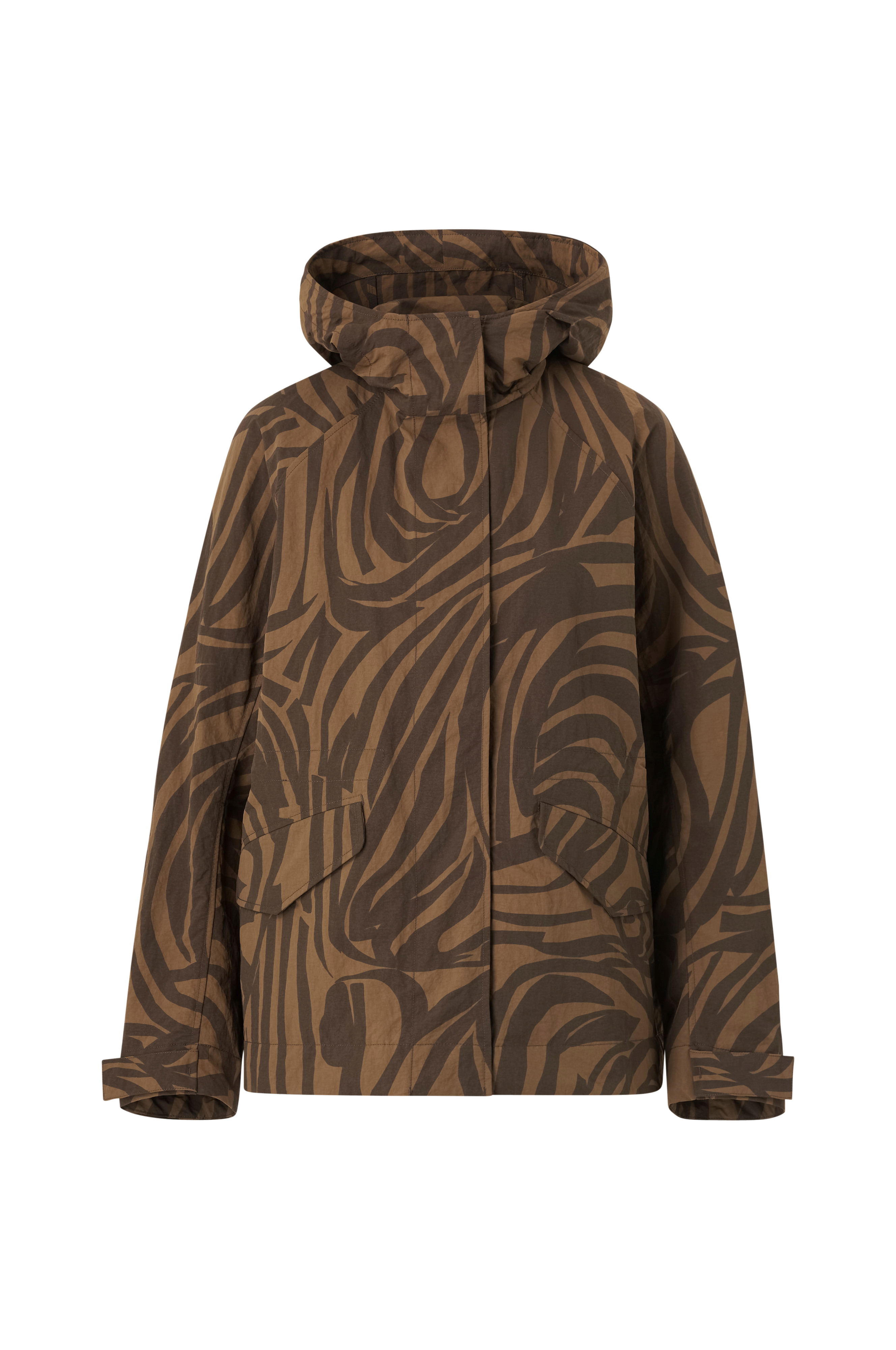 Musteet takissa on rento, suora istuvuus ja siinä on Jokuraita -kuvio. Takissa on korkea pystykaulus ja kiinteä huppu, jossa on kiristysnauhat hupun sisäpuolella. Vuorittomassa takissa on vetoketjukiinnitys ja nepparit etulistan alla, sisäpuolelta kiristettävä kiristysnyöri vyötäröllä ja suuret läppätaskut edessä. Löysissä raglanhihat hihansuissa on nepparikahvat hihansuissa.