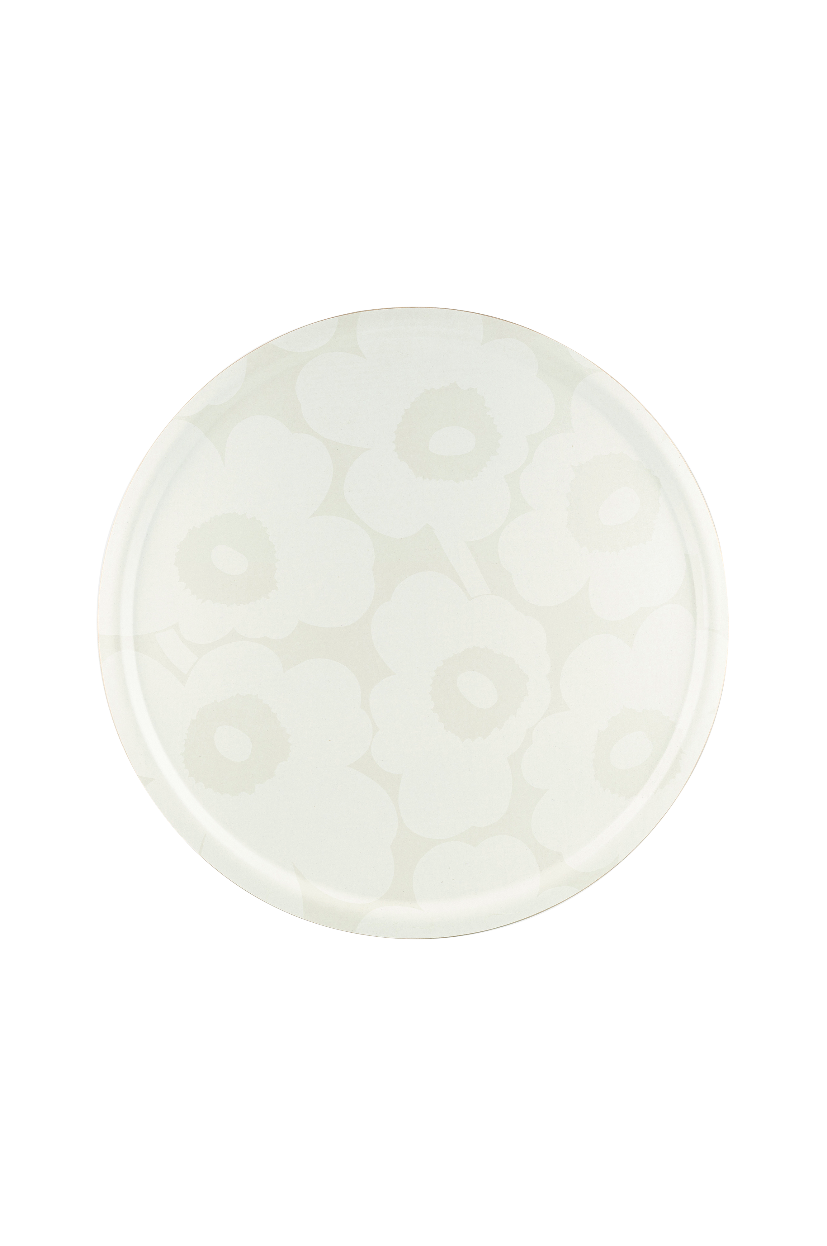 Tämä suuri pyöreä tarjotin on valmistettu laminoidusta poppelivanerista, ja siinä on valkoista valkoisella oleva Unikko -kuvio. Suosittelemme, että tarjotin pyyhitään puhtaaksi kostealla liinalla tai pestään käsin. Älä liota. Yhteensopiva tammisen tarjottimen jalustan kanssa. Unikko (unikko), joka symboloi luovuutta, syntyi aikana, jolloin Marimekon mallistoissa ei juuri ollut kukkakuvioita. Maija Isola kuitenkin innostui kukkateemasta ja päätti luoda kokonaisen valikoiman uudenlaisia kukkakuvioita.