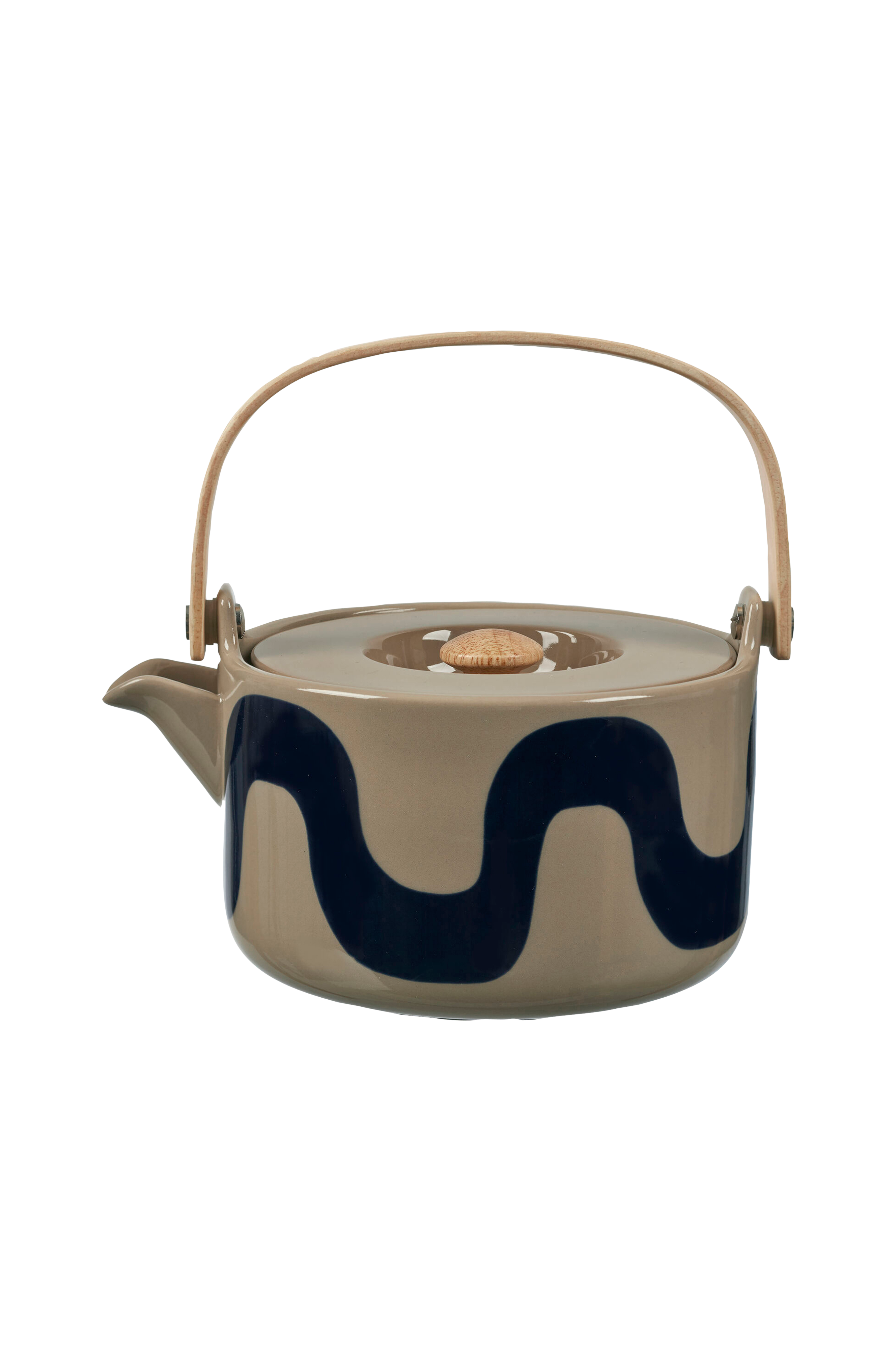 Marimekon pelkistetyn ruskea Seireeni, jonka graafisessa, aaltoilevassa kuviossa on kolme eri väriä. Teekannulla on keskeinen rooli pöydässä. Monet teen ystävät ilahtuisivat, jos he saisivat tämän teekannun lahjaksi. Materiaali: kivitavaraa.