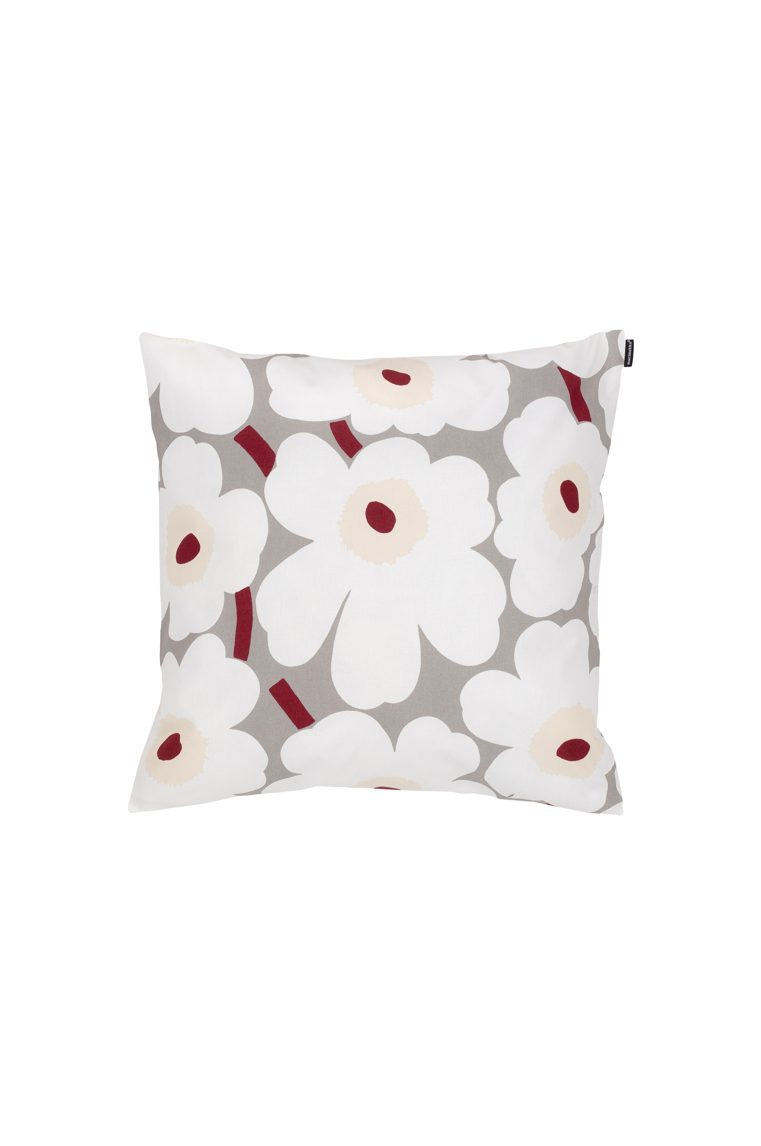 Tässä puuvillatyynynpäällisessä on Pieni Unikko -kuvio, joka on painettu Helsingissä. Päällisessä on vetoketju toisella puolella.
