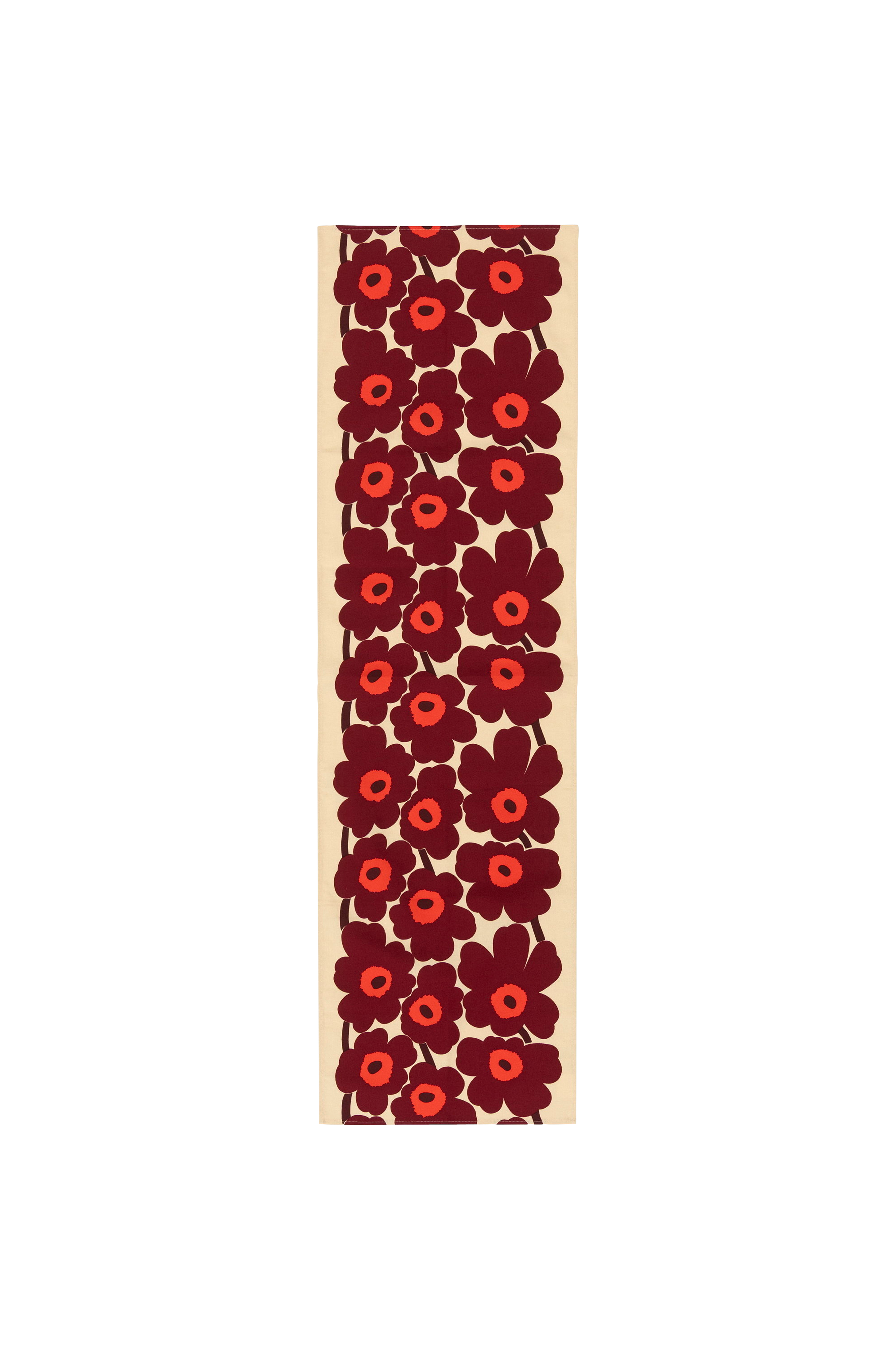 Pieni Unikko -kuosi on kuvattu tässä juoksupöydässä, joka on valmistettu valkaisemattoman puuvillan ja pellavan sekoituksesta. Pieni Unikko -kuosi on painettu Helsingissä. Tämä tuote sisältää 33 % pellavaa. Tässä tuotteessa käytetty puuvilla on 46 % kierrätettyä puuvillaa. Kierrätyskuituja sisältävissä kankaissa sekä valkaisemattomissa kankaissa on luonnostaan elävä väri ja pinta, jossa voi esiintyä pieniä erivärisiä alueita. Tuotteiden välillä voi olla eroja tämän ominaisuuden suhteen.