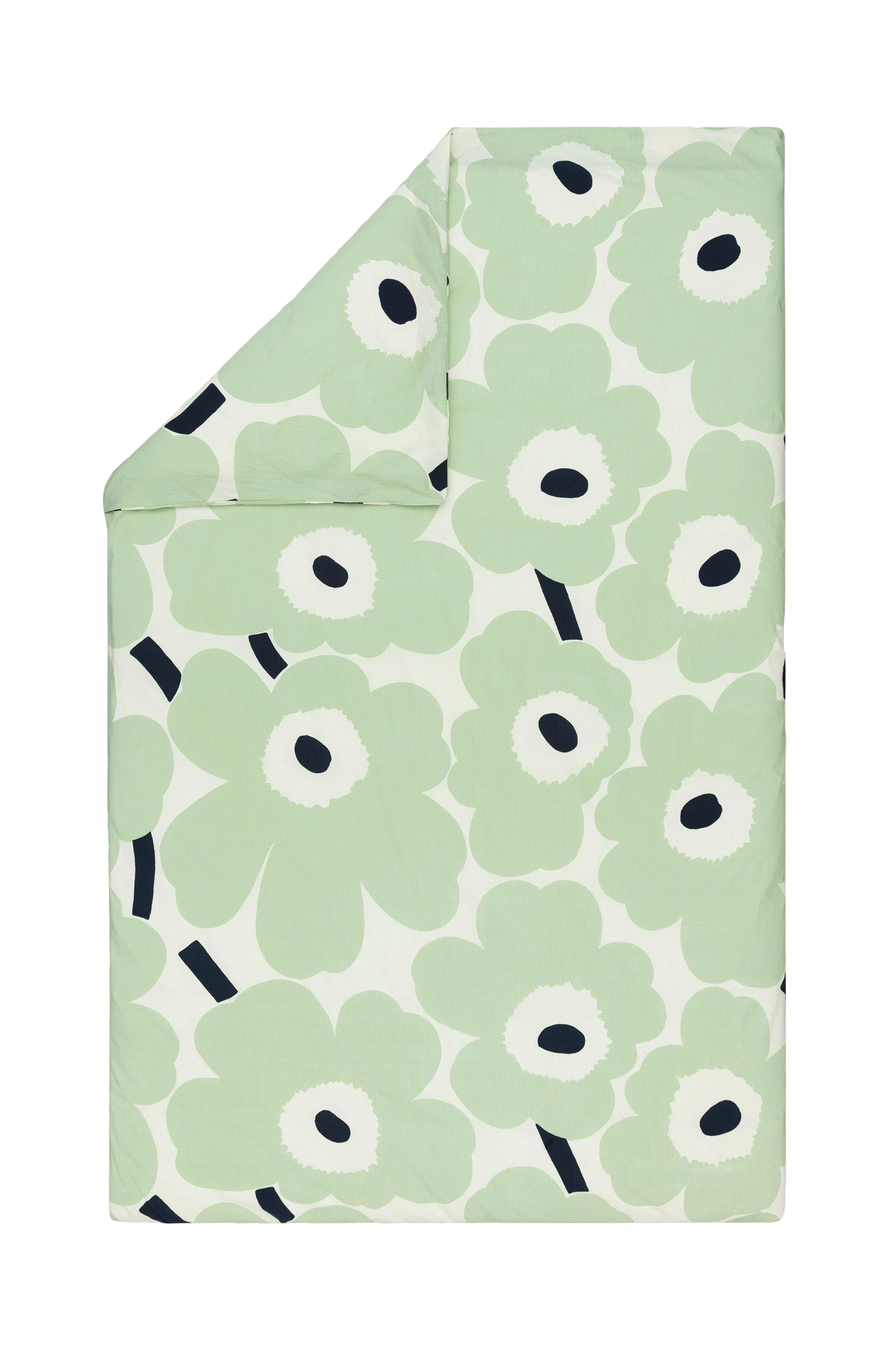 Unikko kuvioitu pussilakanasetti on valmistettu 177 Tc puuvillasta seersucker. Yläkulmissa olevat käsiaukot helpottavat peitteiden vaihtoa. Unikko on Maija Isolan vuonna 1964 luoma ja siitä on sittemmin tullut kansainvälinen painomuotoilun ikoni. Marimekon perustaja Armi Ratia oli sitä mieltä, että aitojen kukkien todellista olemusta ei ole mahdollista vangita uskollisesti painokuviin, minkä vuoksi kukkapainatukset jätettiin aiemmin Marimekon mallistojen ulkopuolelle. Niinpä Maija Isola suunnitteli Unikko niin, että se on pikemminkin abstraktio kukasta kuin fotorealistinen toisinto. Nykyään Unikko on voimakas ilon ja luovuuden symboli, joka on integroitu saumattomasti Marimekon design-identiteettiin.