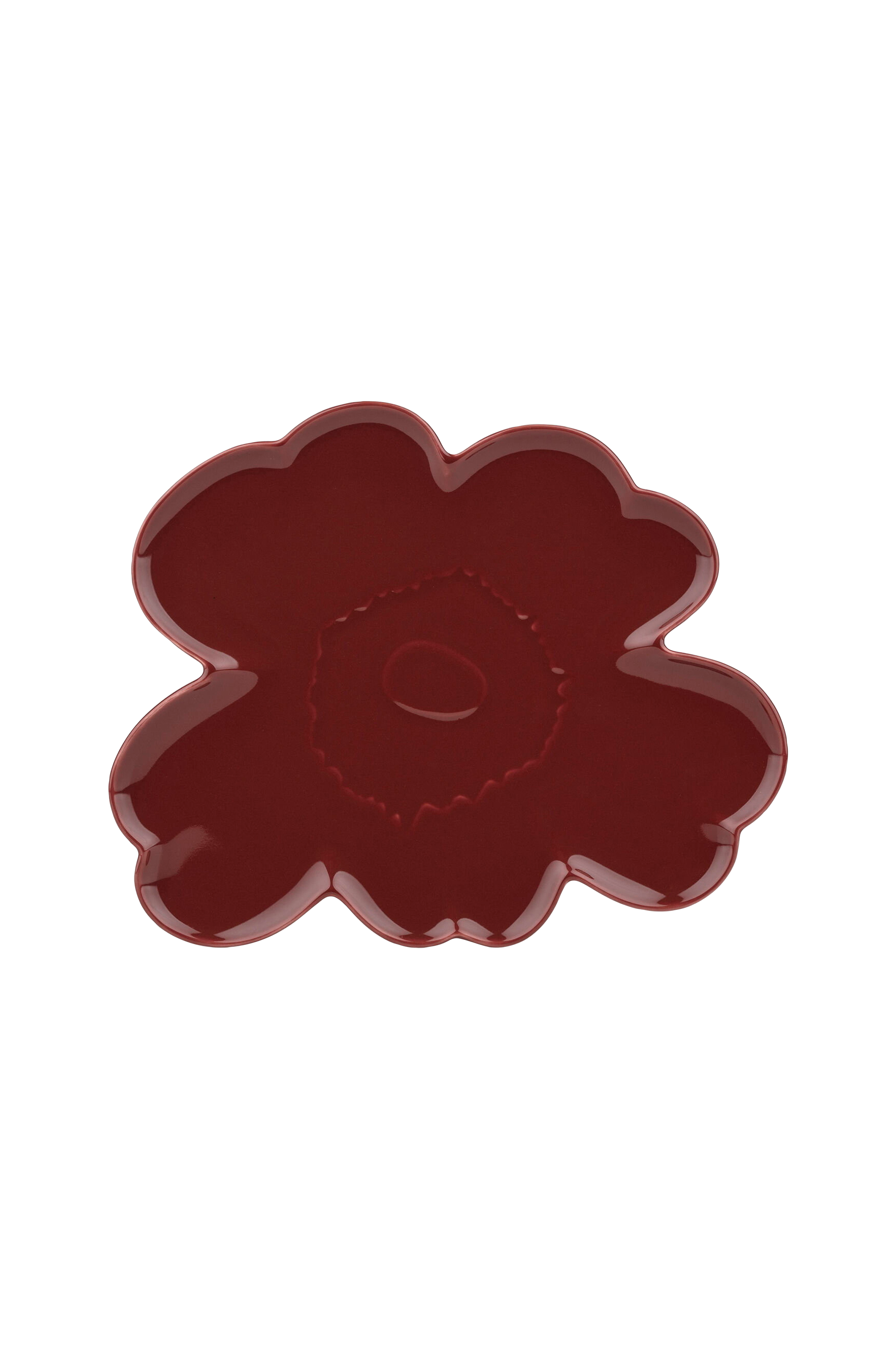 Suuri Unikko kukkien muotoinen lautanen on valmistettu keramiikasta, jossa on viininpunainen lasite. Värillinen lasite saattaa antaa lautaselle eloisan värin. Suosittelemme lautasen pesua käsin. Vaikka sen voi pestä koneessa, ainutlaatuinen muotoilu saattaa vahingoittua, jos se joutuu kosketuksiin muiden astioiden kanssa. Tuote on pakattu Marimekko Logo -kuvioiseen laatikkoon.