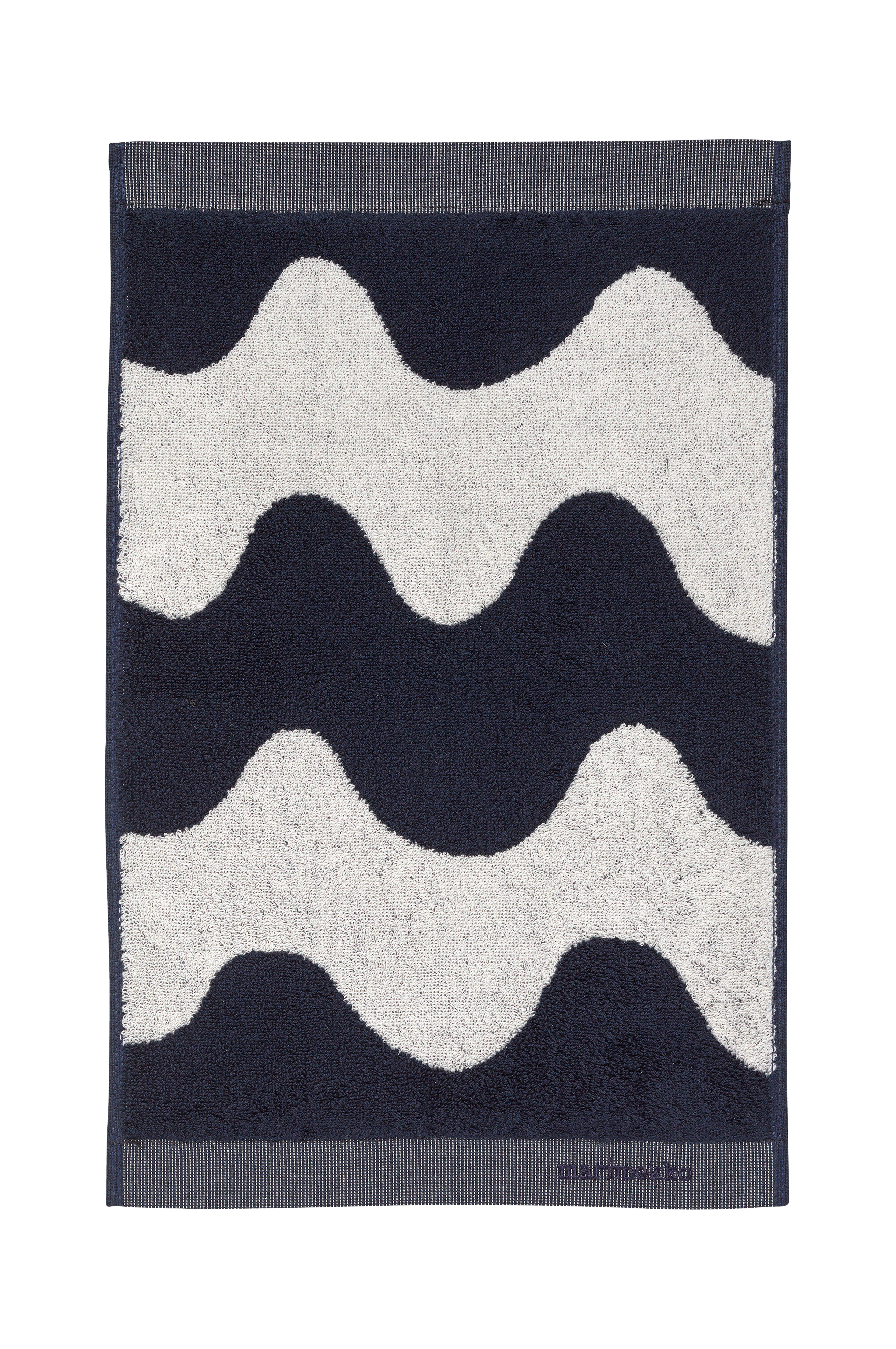 LOKKI-vieraspyyhe 100% puuvillaa. Idea Lokki-malliin syntyi Maija Isolan katsellessa pieniruutuista ikkunaa, jonka eteen oli vedetty verho. Aurinko paistoi ja leveillä poimuilla olevaan verhoon muodostui aaltomaisia varjoja. Maija sai ahaa-elämyksen: jos kankaaseen painetaan aallot valmiiksi, vähäkin kangas näyttää runsaalta ja poimutetulta.
