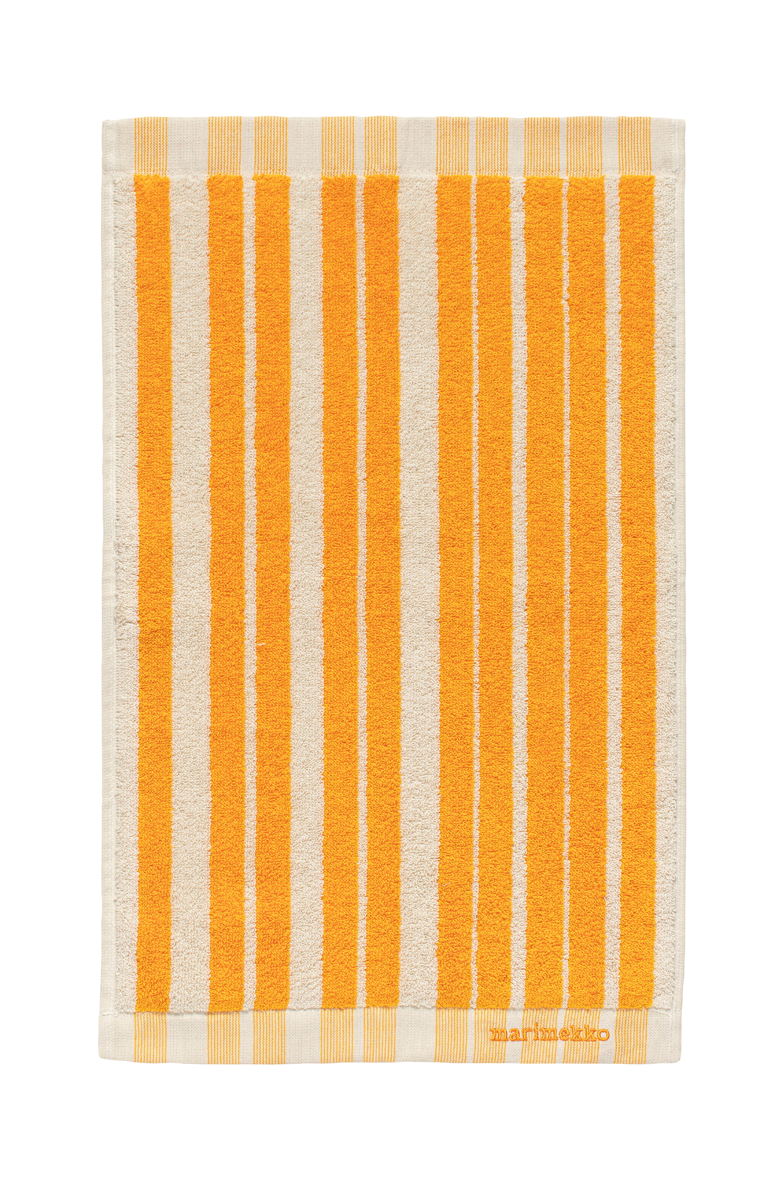 Tässä vieraspyyhkeessä on Raide -kuvio. Pyyhe on valmistettu puuvillafroteesta, joka sisältää 65 % luomupuuvillaa ja 35 % kierrätettyä puuvillaa. Kierrätyskuidut ovat peräisin suljetusta tuotannosta, jossa Marimekon mallistojen valmistuksessa syntyvä tekstiilijäte käytetään uusien Marimekko-tuotteiden raaka-aineena. Raidat ovat aina olleet olennainen osa Marimekon kuosimaailmaa. Eloisa vapaalla kädellä tehty Raide (junarata) on yksi Annika Rimalan luomista lukemattomista Marimekko-raidoista.