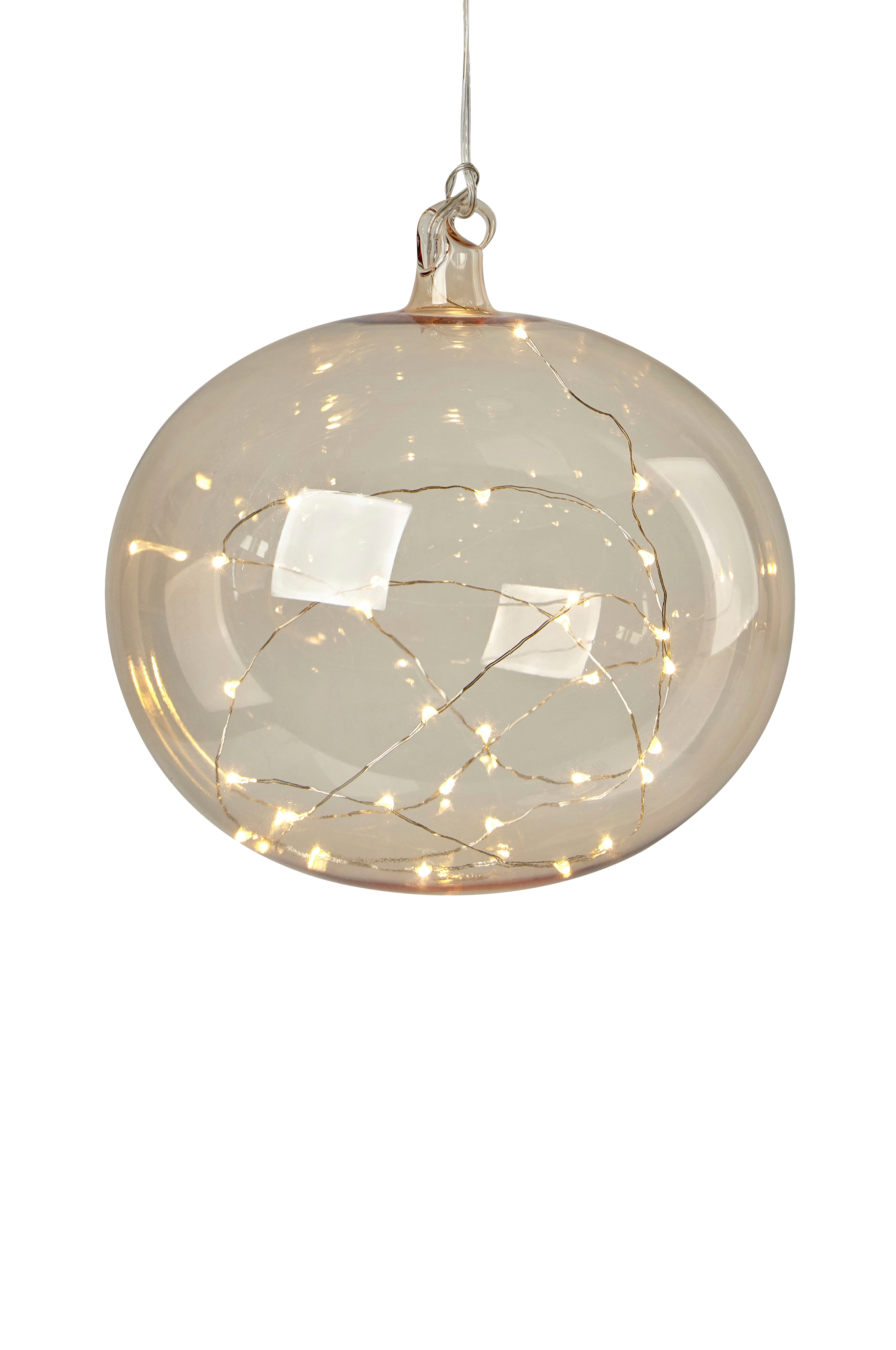 Roikkuva Lina-lasipallo. Lasipallo Ø 18 cm. Paristorasia. Toimii kolmella AA-paristolla (eivät sisälly toimitukseen). Johdon pituus 150 cm.