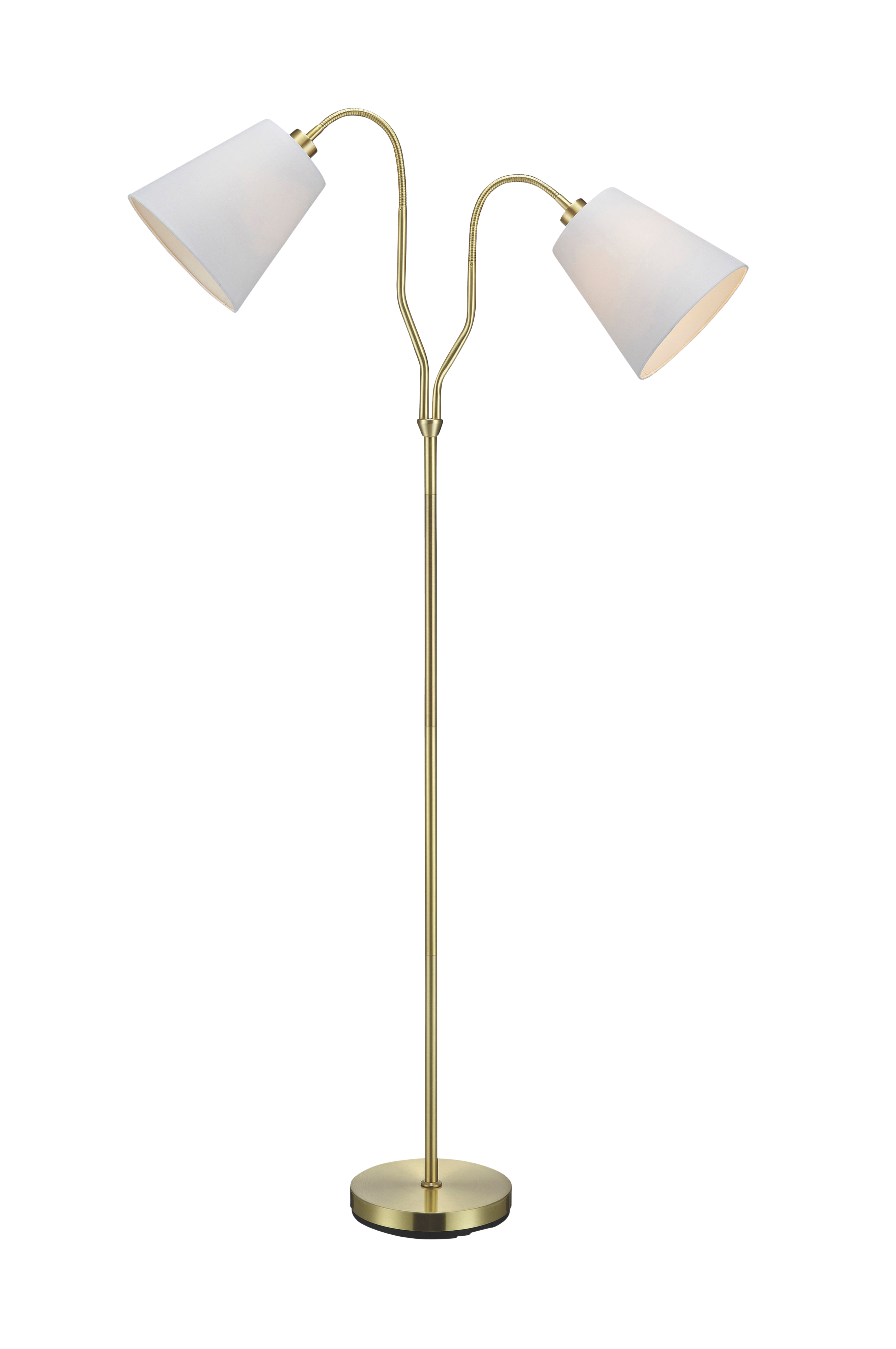 Markslöjd Modena -lattiavalaisin. Messinginväristä metallia ja valkoiset varjostimet. Erillinen virtakytkin molemmissa varjostimissa. Iso E27-lampunkanta ja varjostinrengas. Enintään 60 W:n hehkulamppu tai vastaava halogeeni-, energiansäästö- tai LED-lamppu.
