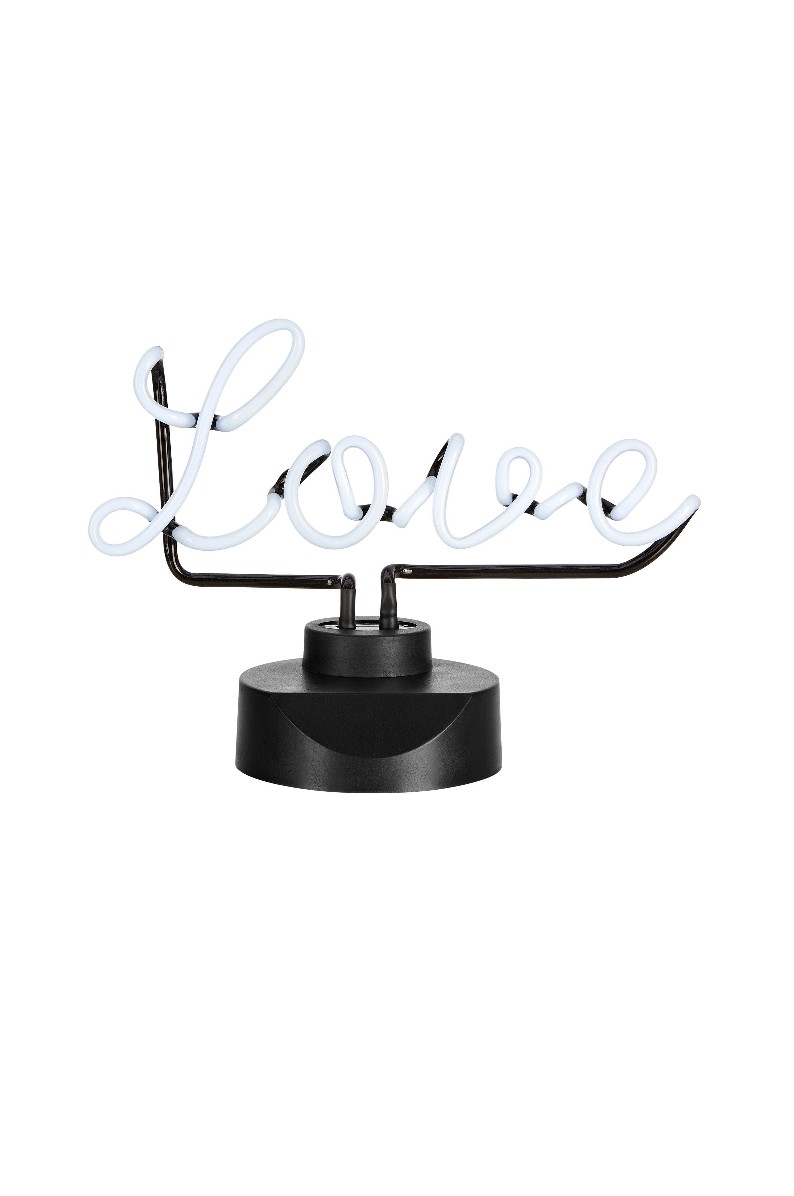 Texas Neon Love -pöytävalaisin ja muuntaja. Leveys 33 cm, korkeus 24 cm. Enintään 6 W. Johdon pituus 3 metriä.