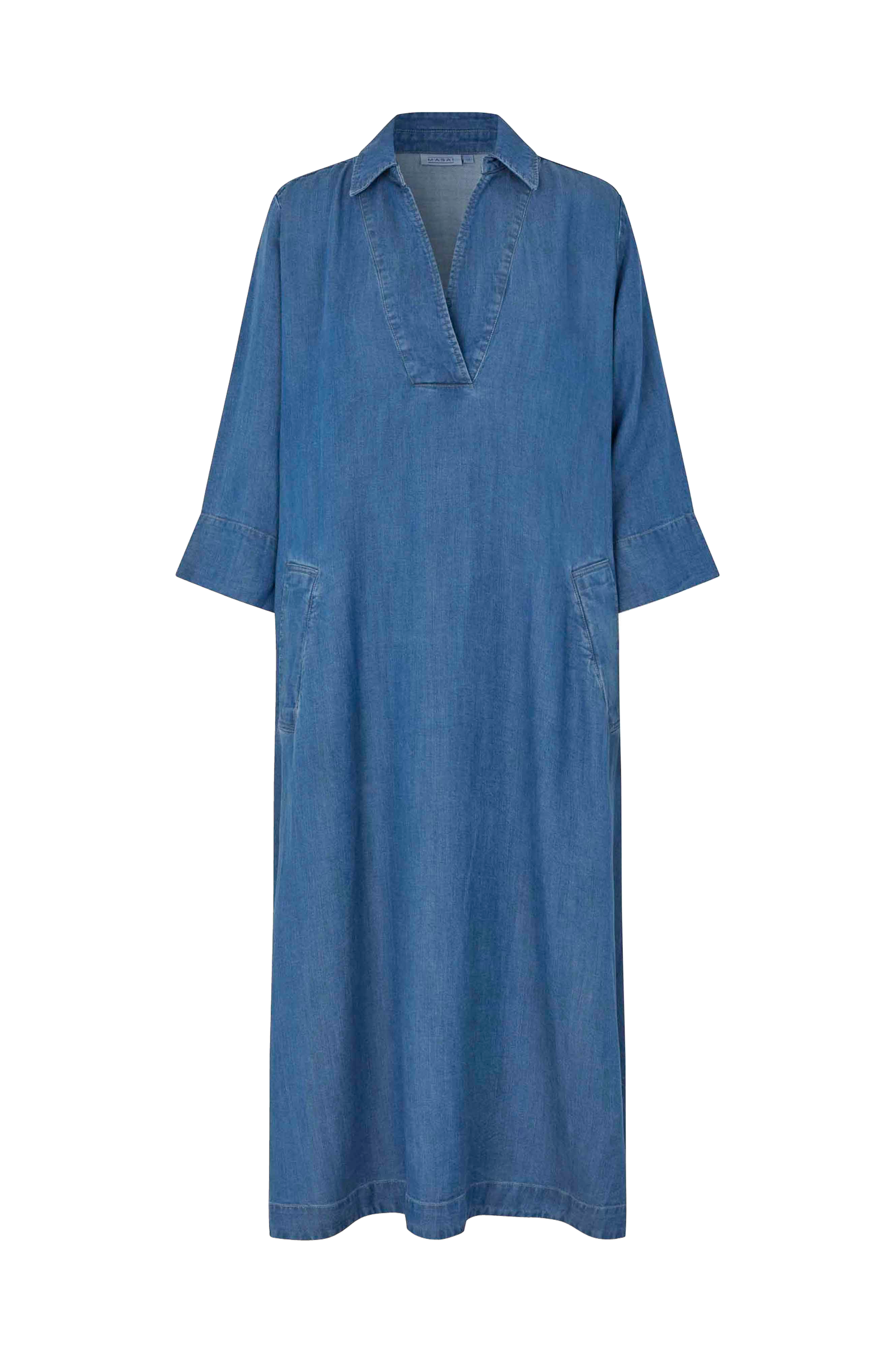 • Pitkä farkkumekko löysällä istuvuudella• 3/4-pituiset hihat halkiolla manseteilla• V-muotoinen pääntie kauluksella• Sivutaskut• Halkiot alhaalla sivuilla• Pituus: 126 cm koossa S