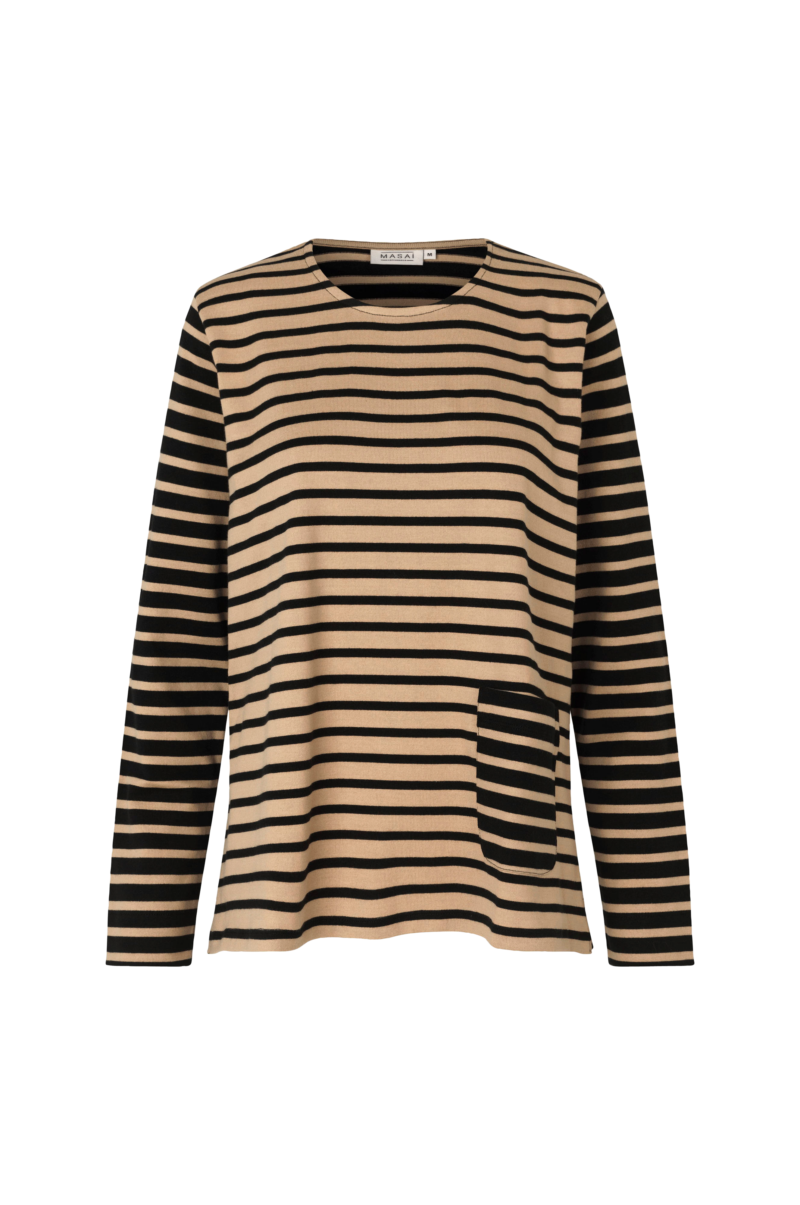 Raidallinen pusero, jossa pyöreä pääntie. Päälleommeltu tasku edessä. Sivuhalkiot helmassa.