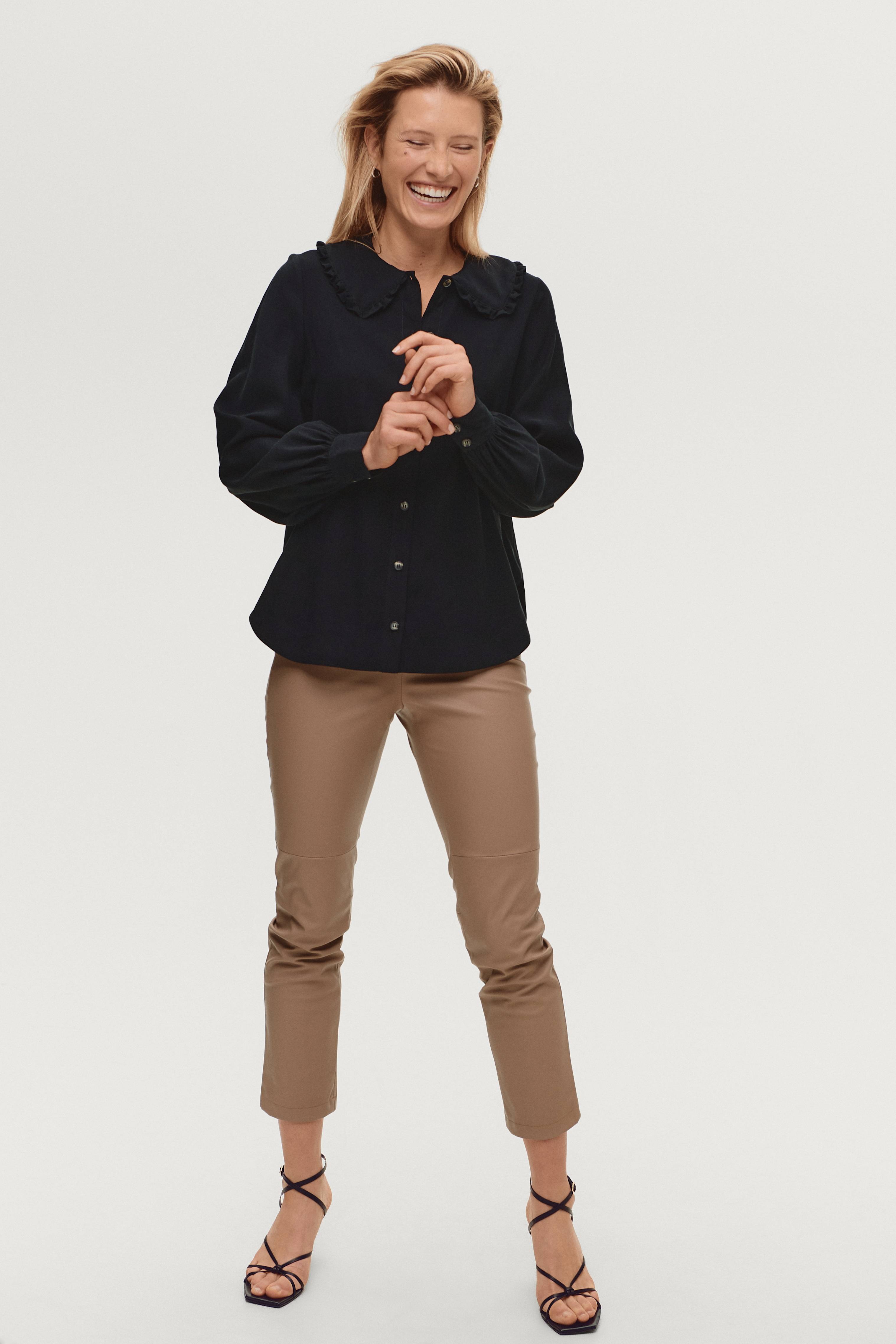 MbyM Torill -paita pehmeää viskoosia. Napit edessä, röyhelökaulus ja pitkät hihat, joissa kalvosin ja napit. Helmassa pyöristetyt sivut ja sivuhalkiot.