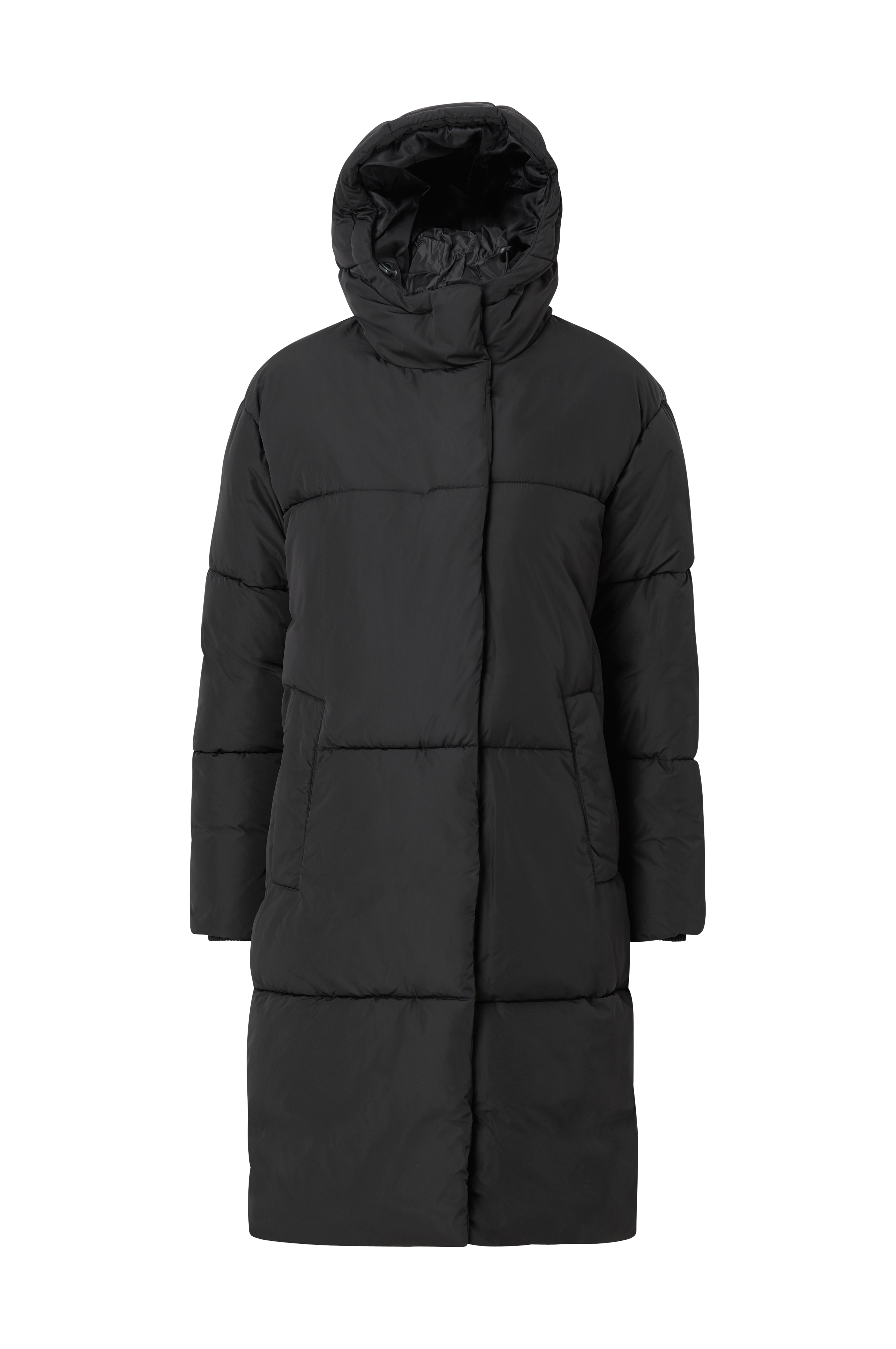 MbyM Merian -toppatakki. Pitkä malli, jossa kaksisuuntainen vetoketju ja painonapit edessä. Piiloresori hihansuissa ja fleecevuorilliset taskut edessä. Kiinteä huppu, jossa nyöri. Pituus n. 101 cm koossa XS/S.