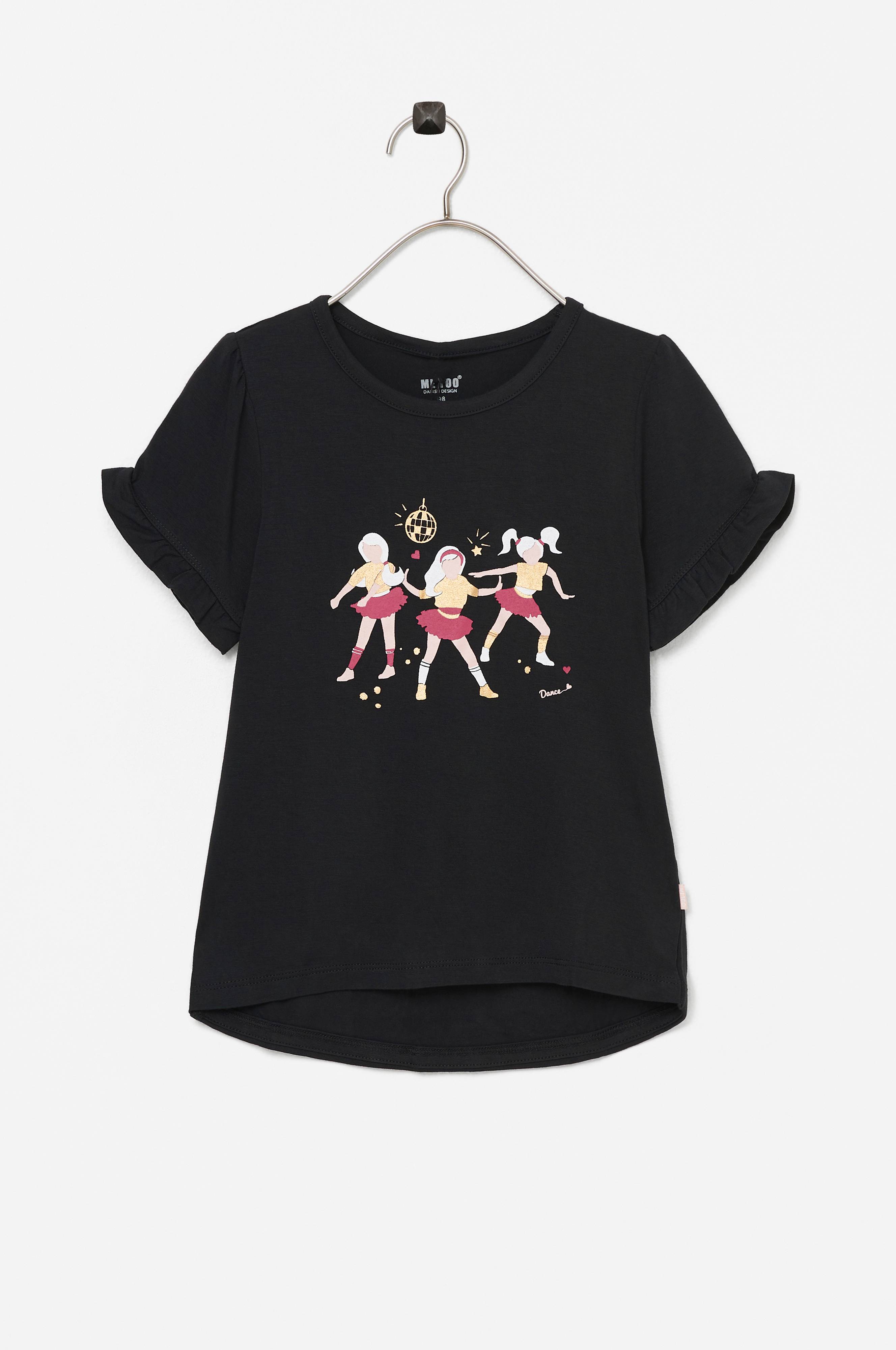 Lyhythihainen Me Too -pusero pehmeää ja joustavaa trikoota. Lyhyet puhvihihat ja pieni röyhelöreuna hihansuissa. Pyöreä pääntie ja painatus edessä.