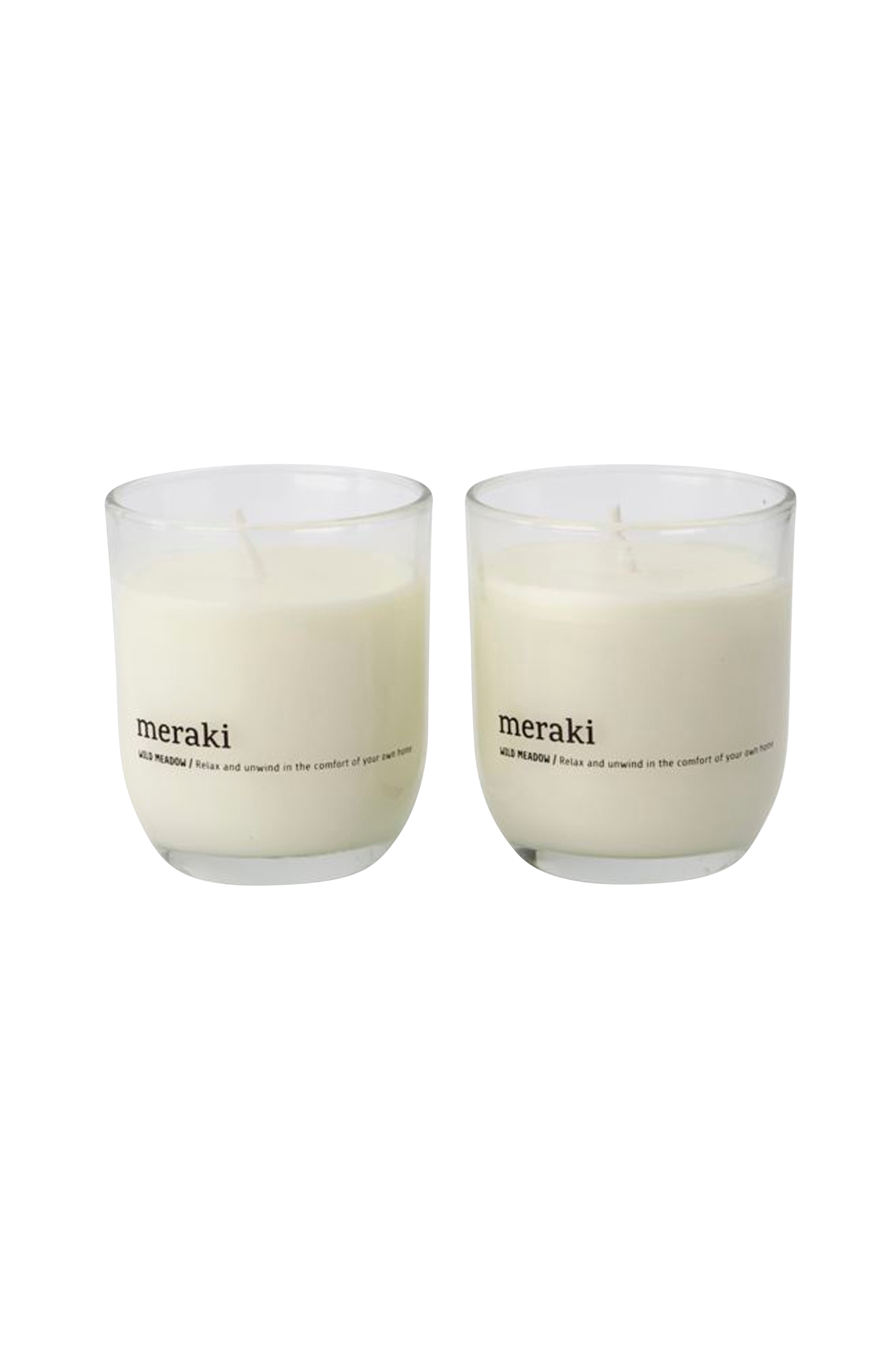 Tuoksukynttilä on lyömätön tunnelmanluoja. Merakin kirkkaisiin lasipurkkeihin pakatut kaksi pientä tuoksukynttilää muuttavat kotisi rentouttavaksi keitaaksi kevyellä kukkaistuoksullaan. Wild Meadow -tuoksu avautuu greipin ja sitruunan sävyillä, joita seuraa kukkainen ruusun, magnolian ja kielon tuoksu. Tuoksun päättää syvä ja täyteläinen myski. Paloaika: 22 tuntia.
