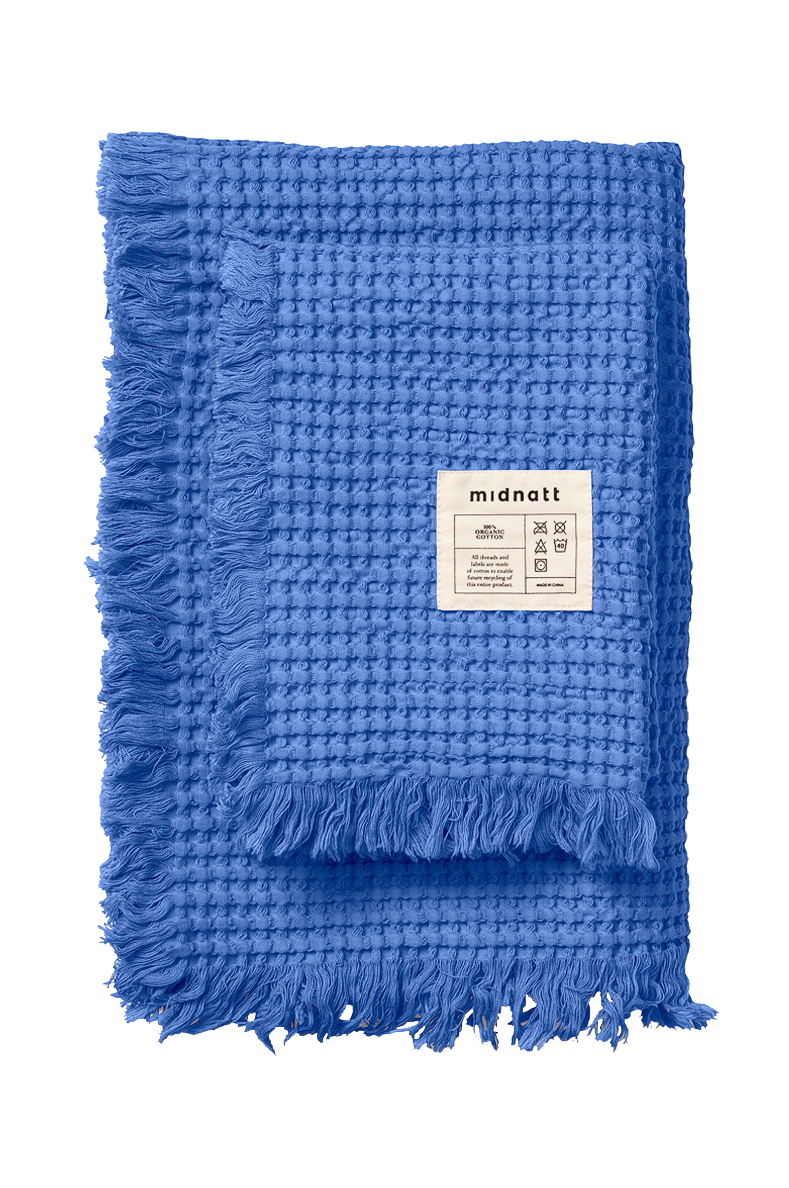 Näitä Midnattin sinisiä, superkuohkeita vohvelipyyhkeitä on saatavana kahta kokoa, yksi iso kylpypyyhe ja yksi pienempi käsipyyhe. Pyyhkeet on valmistettu 100-prosenttisesta luomupuuvillasta, ja niissä on isokokoisia vohveleita, jotka takaavat upean ulkonäön ja tuntuman. Pienessä pyyhkeessä on kaksi ripustuslenkkiä, ja isommassa on yksi ripustuslenkki pitkällä sivulla. Suunnittelimme ylisuuren pesulapun niin, että sen voi halutessaan helposti poistaa. Isomman kokoista pyyhettä voi käyttää myös pienenä peittona.