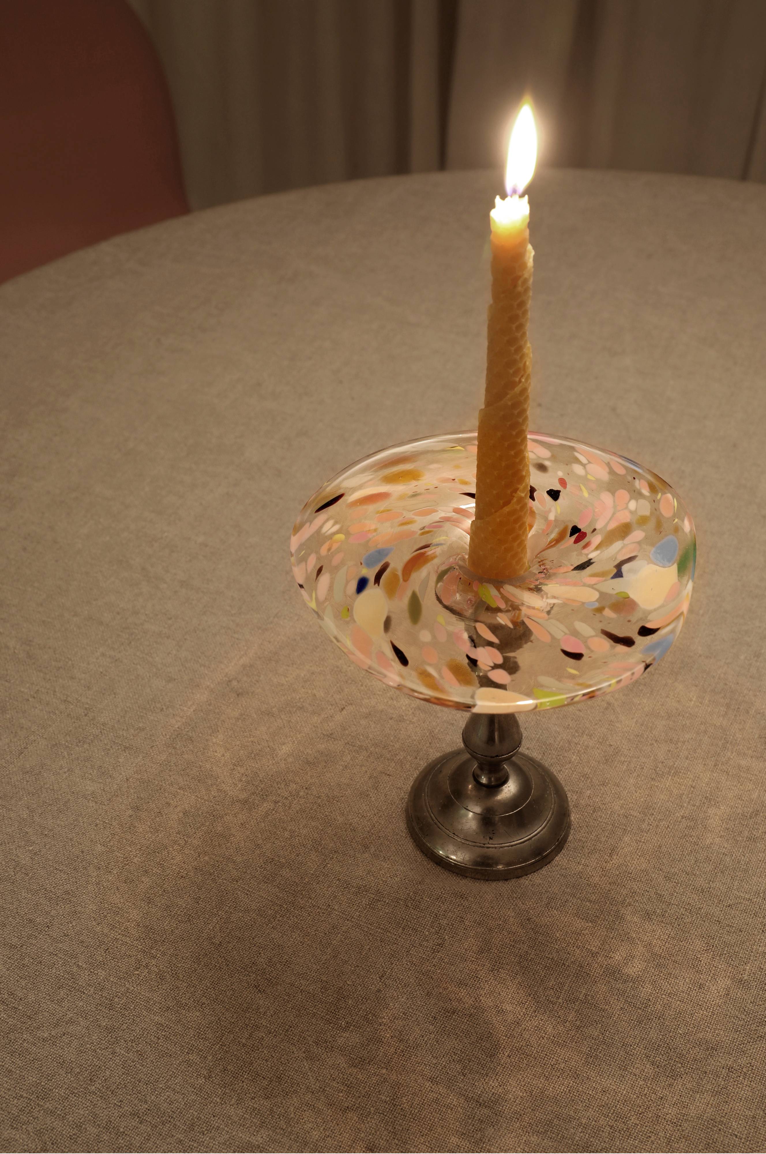Iso kynttilämansetti paksua lasia. Valmistettu käsin Smoolannissa yhteistyössä Mimoun ja Bergdalahyttanin kanssa. Mansetti sopii tavalliseen kruunukynttilään. Konfettikuvio luo kauniita varjoja pöytään, kun kynttilä sytytetään. Painavassa, käsintehdyssä lasissa on epäsäännöllinen muoto, joka luo veistoksellisen ilmeen kynttilänjalkaan. Jokainen kynttilämansetti on muodoltaan, väriltään ja kuvioltaan ainutlaatuinen. Yhdistä se pieneen Liv-maljakkoon luodaksesi kauniin asetelman. Halkaisija 15 cm.