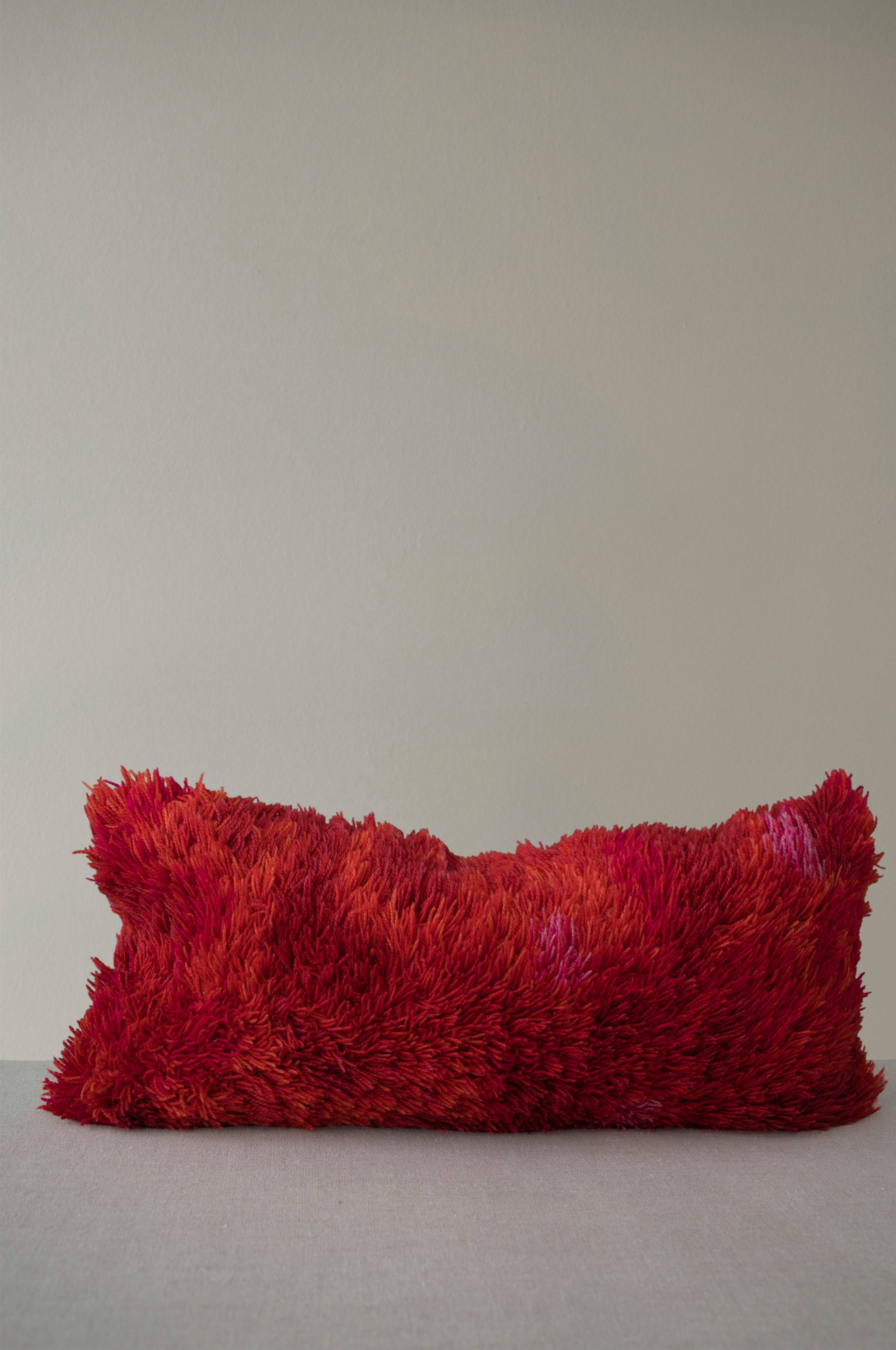 Tyynyn etuosa on valmistettu vanhoista ryijymatoista ja seinävaatteista leikatuista paloista. Takaosa on ylijäämäkangasta. Materiaalien uusiokäyttö uusien materiaalien valmistamisen sijaan on kestävämpi valinta ja yksi tapa vähentää tekstiilijätteen määrää. Kuviollinen etupuoli ja takaosa yksiväristä samettia. Tyynyjen kuviot ja värisävyt vaihtelevat ja pieniä kauneusvirheitä voi esiintyä. Tyynyt ommellaan paikallisesti Ruotsissa. Myydään muhkean sisätyynyn kanssa. Sisätyynyn täytteenä on Oeko-Tex®-sertifioituja vesilinnun höyheniä. Kemiallinen pesu. Koko: 30x70 cm.