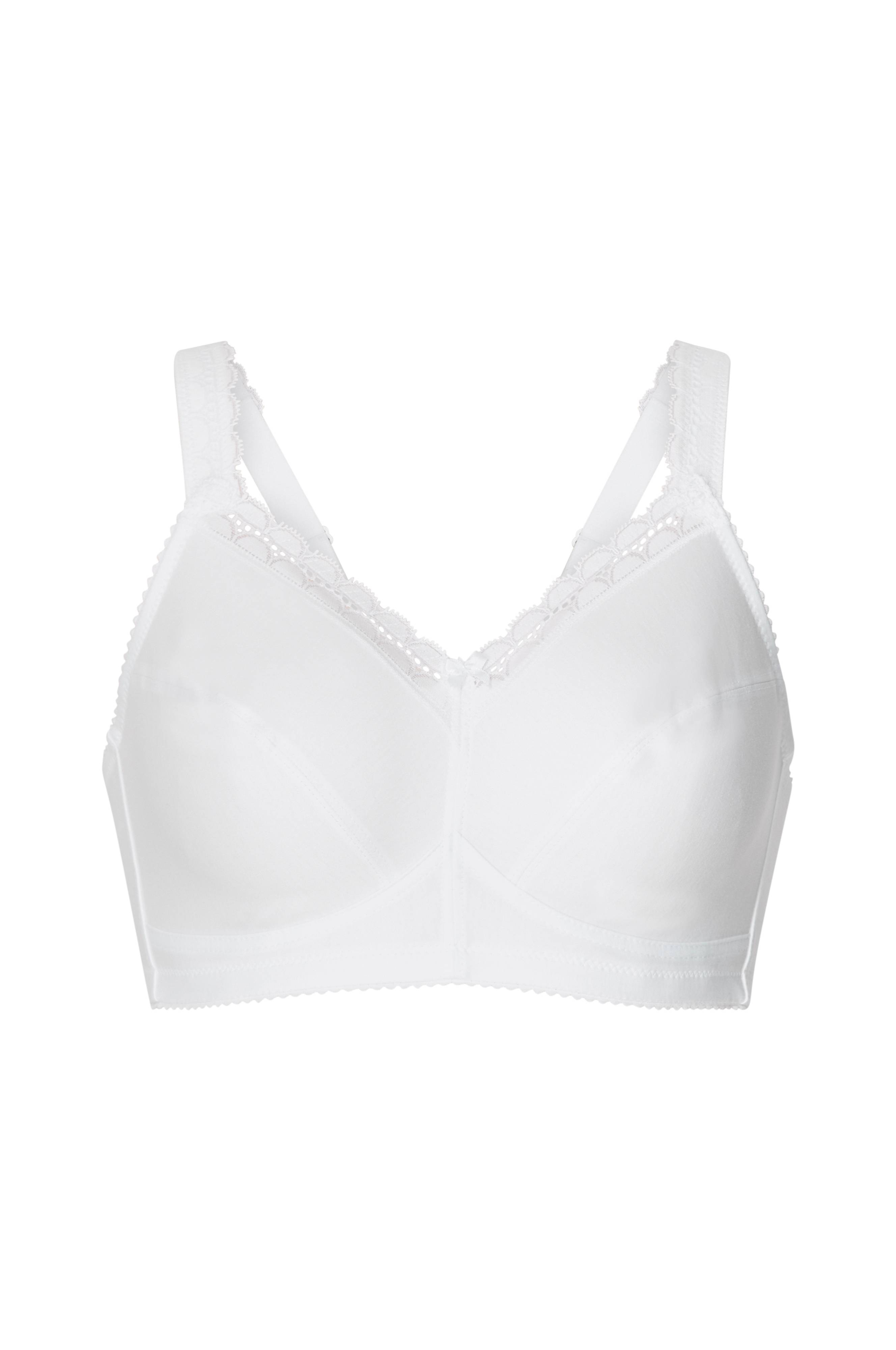 Ajattomat, pelkistetyt ja kaarituettomat rintaliivit puuvillaa, joka antaa vartalon hengittää. Toppaamaton ja vuoriton täyskuppi antaa hyvän peittävyyden. Kupinsauma on litteä, joten se näkyy vähemmän vaatteiden alta. Pitsikoristelu kupin reunoissa ja olkaimissa. Säädettävät, joustavat olkaimet. Joustava U-mallinen selkä, jossa säädettävä hakassuljenta.