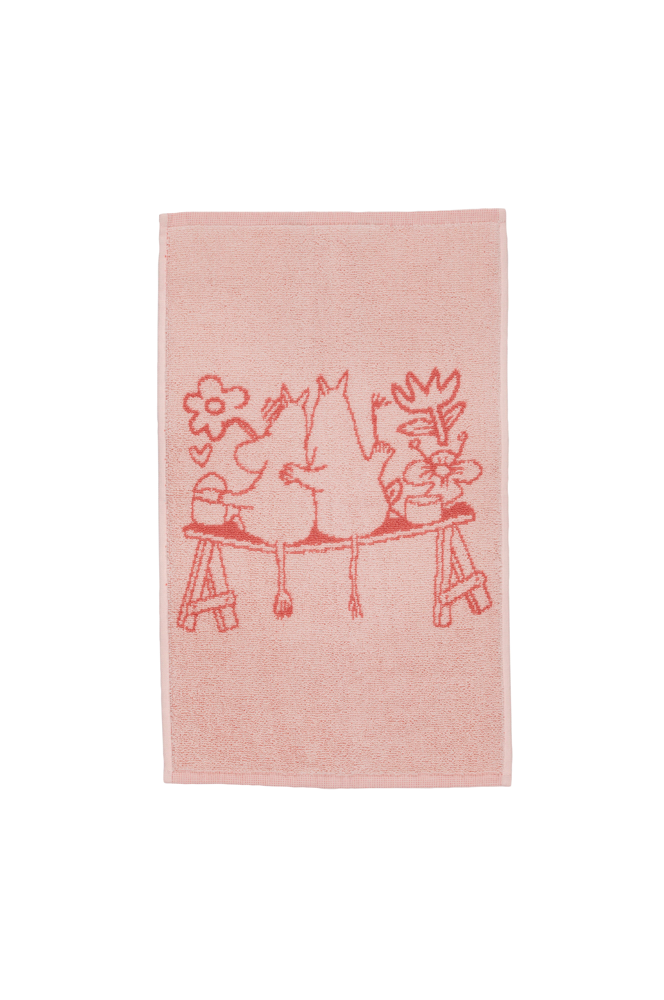 Pehmeän Muumi-käsipyyhkeen teemana on rakkaus. Hellyttävässä kohtauksessa Muumipeikko ja Niiskuneiti maalaavat yhdessä kukkakoristeita talon seinälle. Kuvitus pohjautuu sarjakuvaan ”Talonrakennus”, jossa Muumipeikko ryhtyy rakentamaan itselleen ja Niiskuneidille omaa taloa. Moomin Arabia, käsipyyhe 30x50 Rakkaus