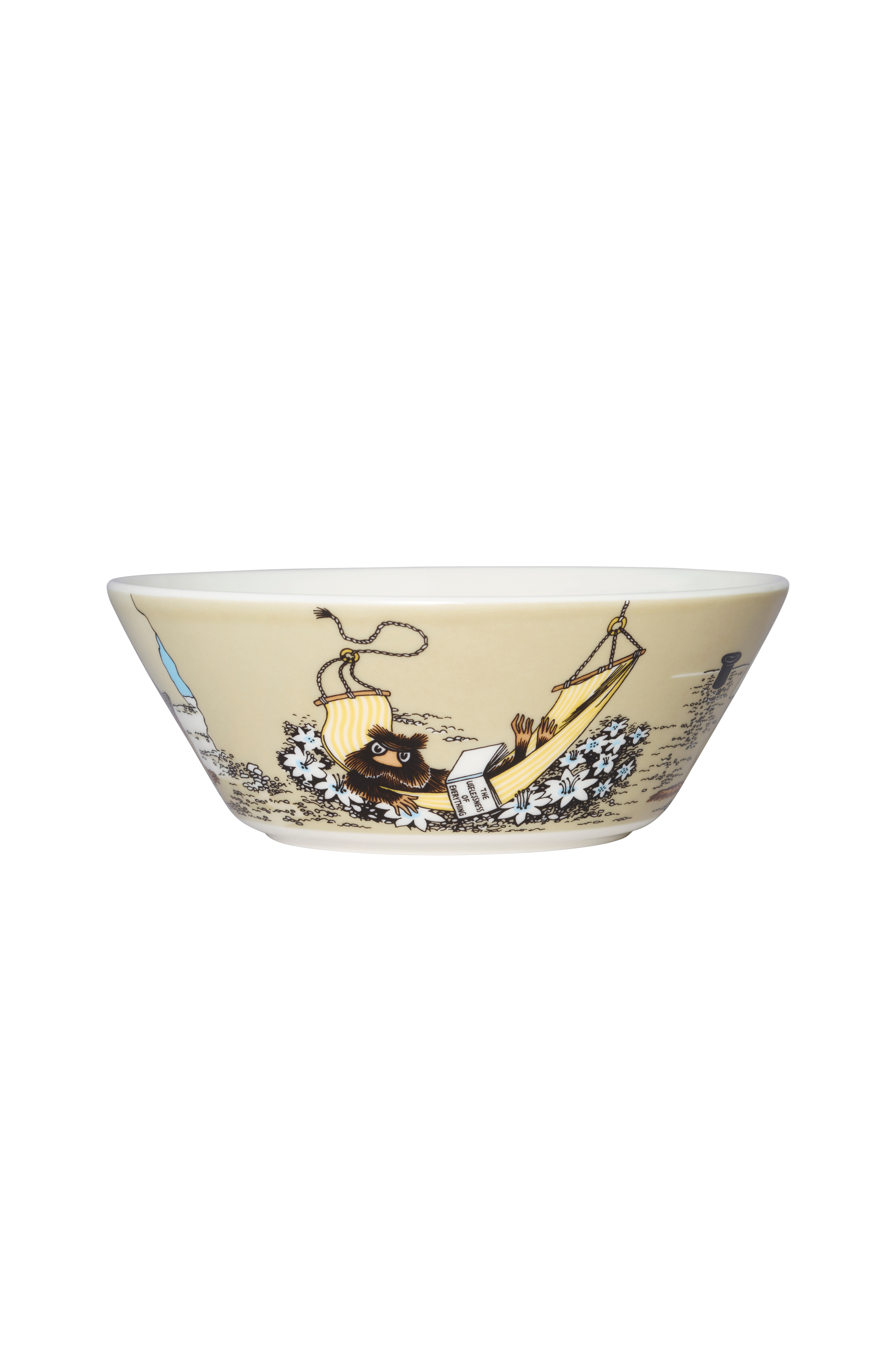 Piisamirotta on rauhaa arvostava filosofi, joka lukee synkkiä teoksia ja jakaa pessimistiset tulevaisuuden näkymänsä myös muille. Parhaiten hän viihtyy muumiperheen riippumatossa lempikirjansa kera. Pahinta, mitä Piisamirotta tietää, on arvokkuutensa menettäminen – sitä tapahtuu turhan usein Muumitalossa. Moomin Arabia, kulho 15 cm, Piisamirotta