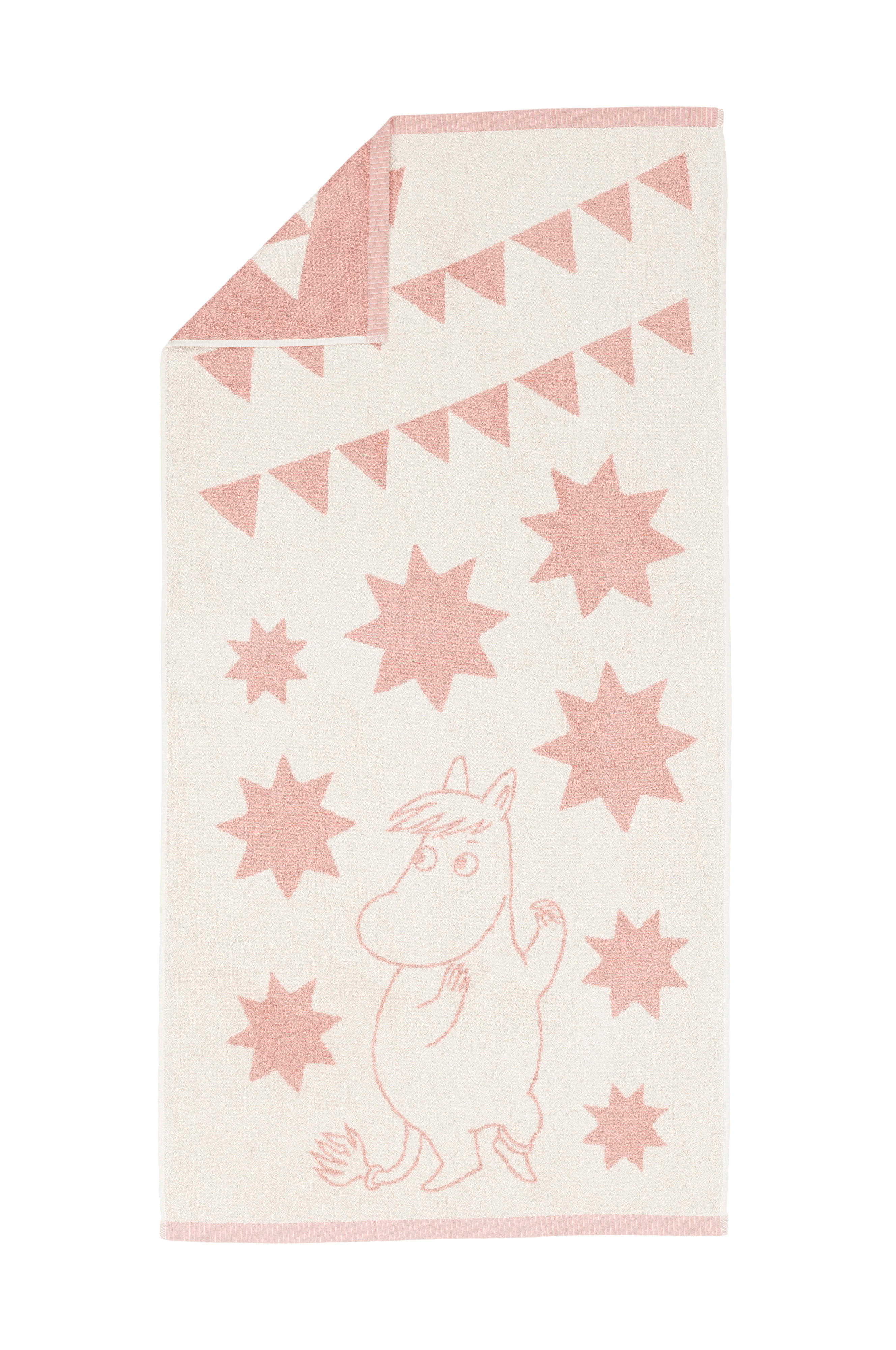 Kääriydy muumikylpypyyhkeen pehmeyteen, jonka kuvituksessa Niiskuneiti kutsuu mukaan sirkustemppuilemaan. Murretut värisävyt sekä iloiset aiheet Tove ja Lars Janssonin 70-luvulla kuvittamasta värityskirjasta henkivät retrotunnelmaa. Luomupuuvillainen kylpypyyhe tuntuu ihanalta ihoa vasten. Moomin Arabia k.pyyhe 70x140, Tähdet vaaleanpun.