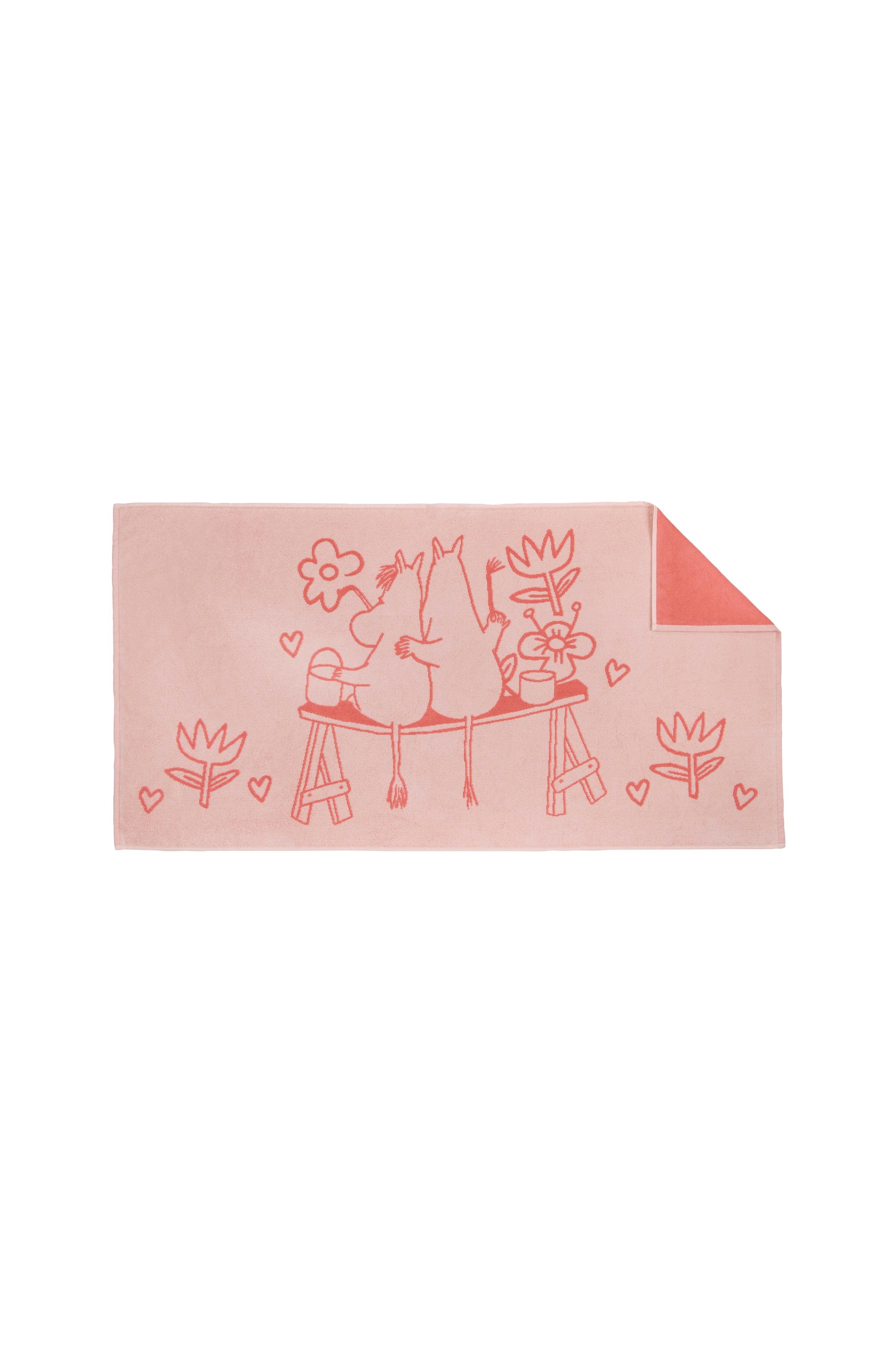 Kääriydy pehmeään Muumi-kylpypyyhkeeseen, jonka teemana on rakkaus. Hellyttävässä kohtauksessa Muumipeikko ja Niiskuneiti maalaavat yhdessä kukkakoristeita talon seinälle. Kuvitus pohjautuu sarjakuvaan ”Talonrakennus”, jossa Muumipeikko ryhtyy rakentamaan itselleen ja Niiskuneidille omaa taloa. Moomin Arabia, kylpypyyhe 70x140 Rakkaus