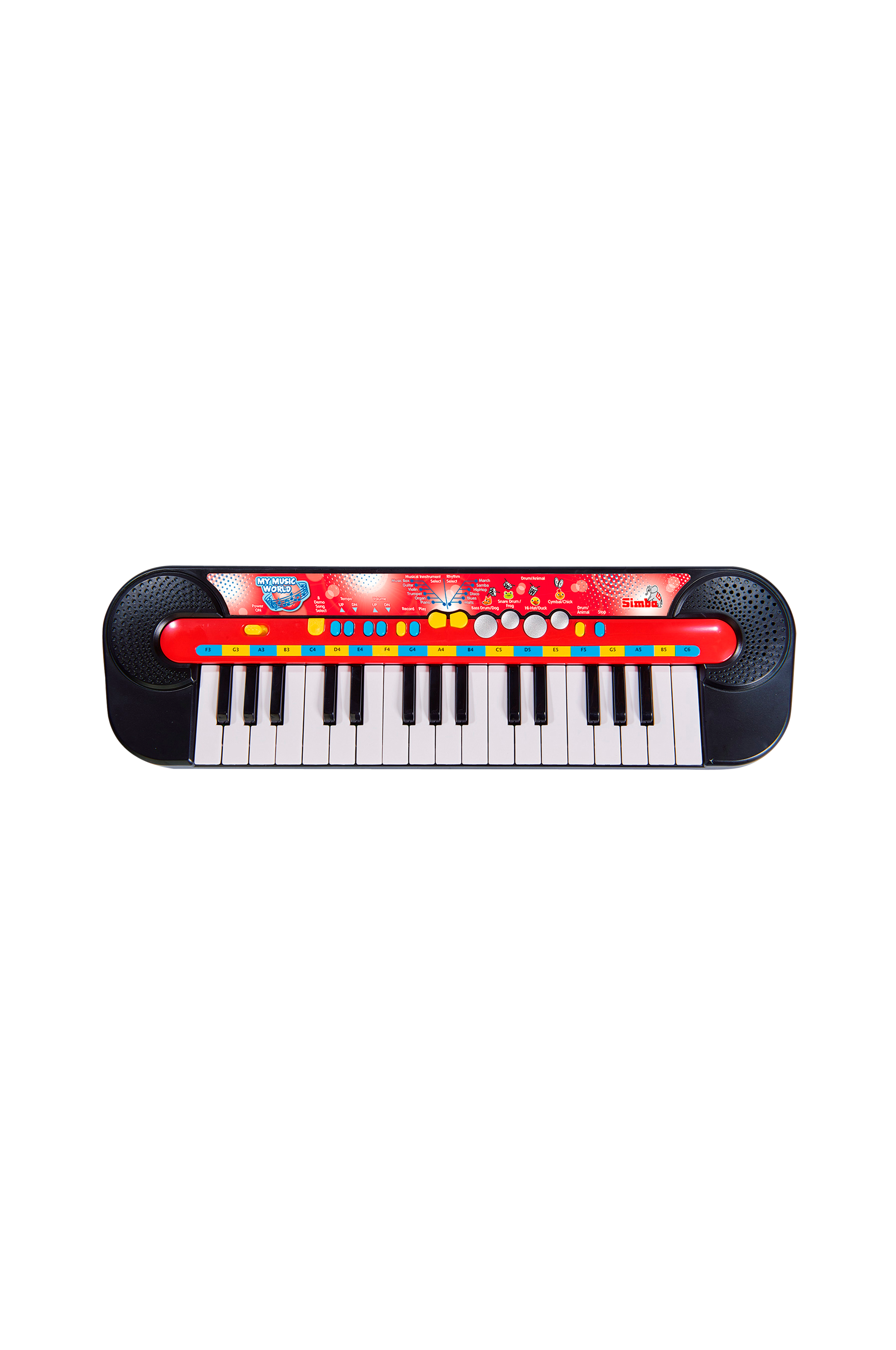 My Music World -piano. 32 kosketinta, 15 demoa, 8 rytmiä ja 4 rumpuääntä.