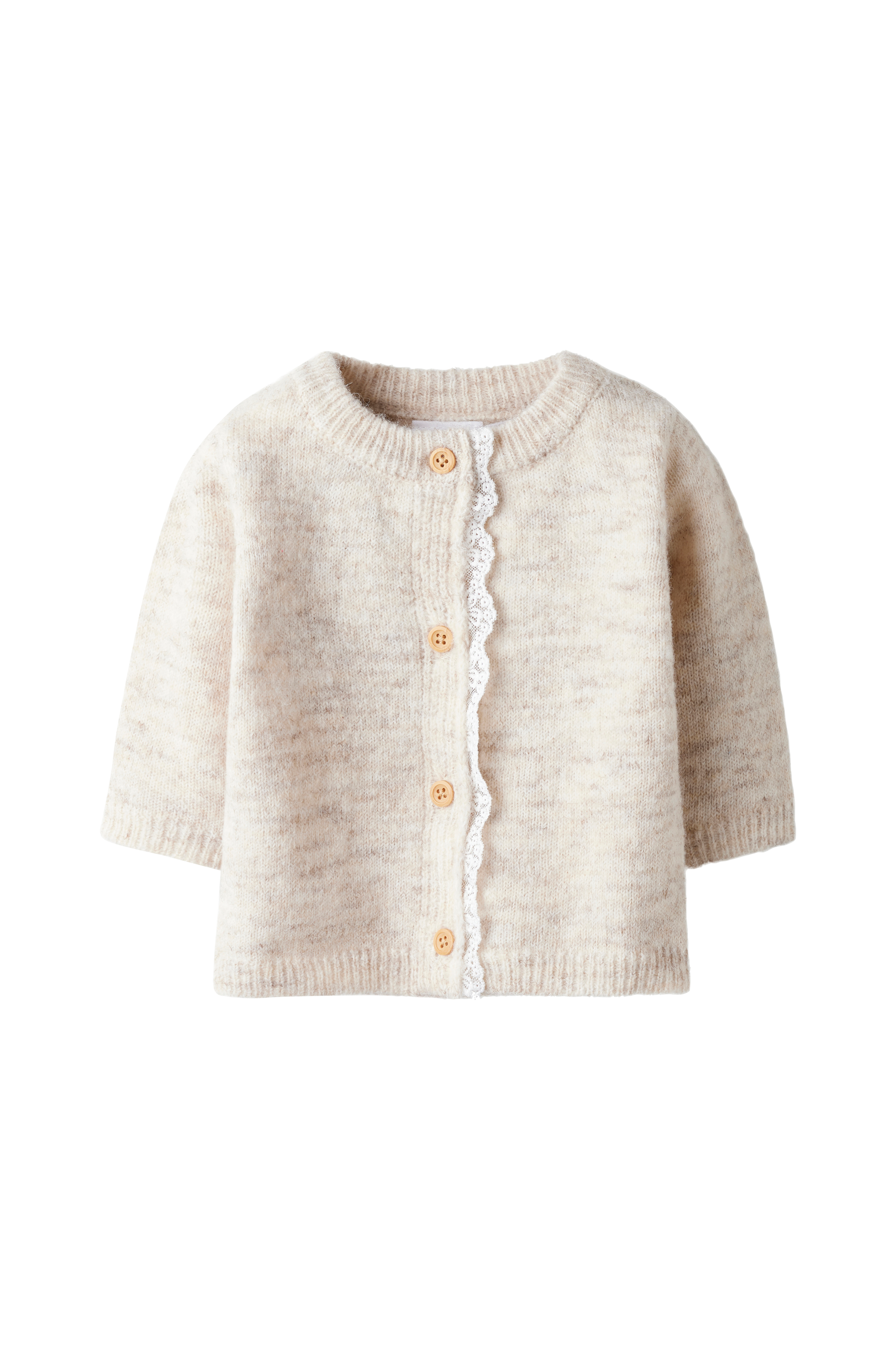 • Pehmeä, tiheäsilmukkainen neuletakki• Pyöreä, ribattu kaula-aukko• Napit• Pitsireuna edessä• Ribbineulos hihansuissa ja alhaalla