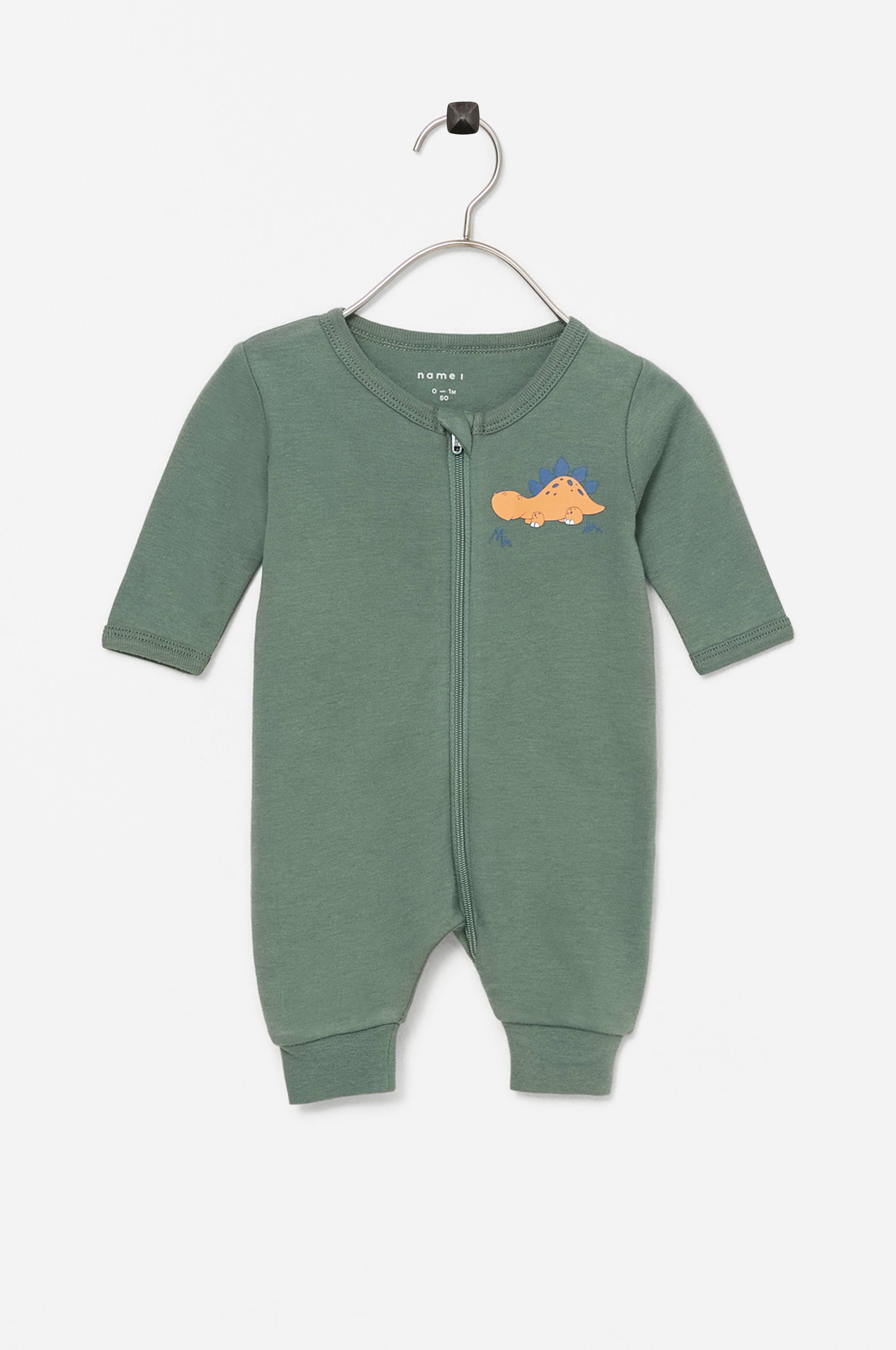 2 pyjamahaalaria pehmeää puuvillatrikoota. Pitkä vetoketju, joka jatkuu alas toiseen lahkeeseen. Lahkeensuissa resorit.