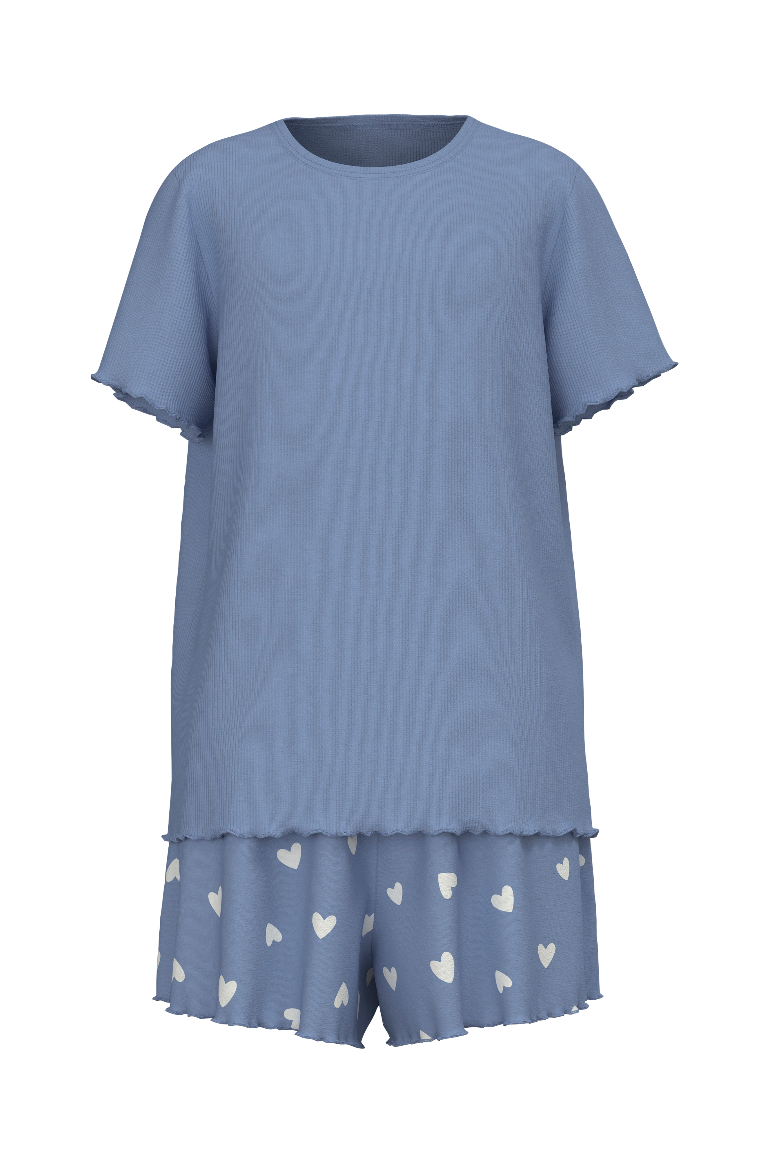 • Kaksiosainen setti pehmeästä, joustavasta puuvillasta• Lyhythihainen, ribattu toppi• Veneen muotoinen kaula-aukko• Aaltoilevat reunat hihansuissa ja alhaalla• Shortsit painetuilla sydäneillä• Joustava vyötärö