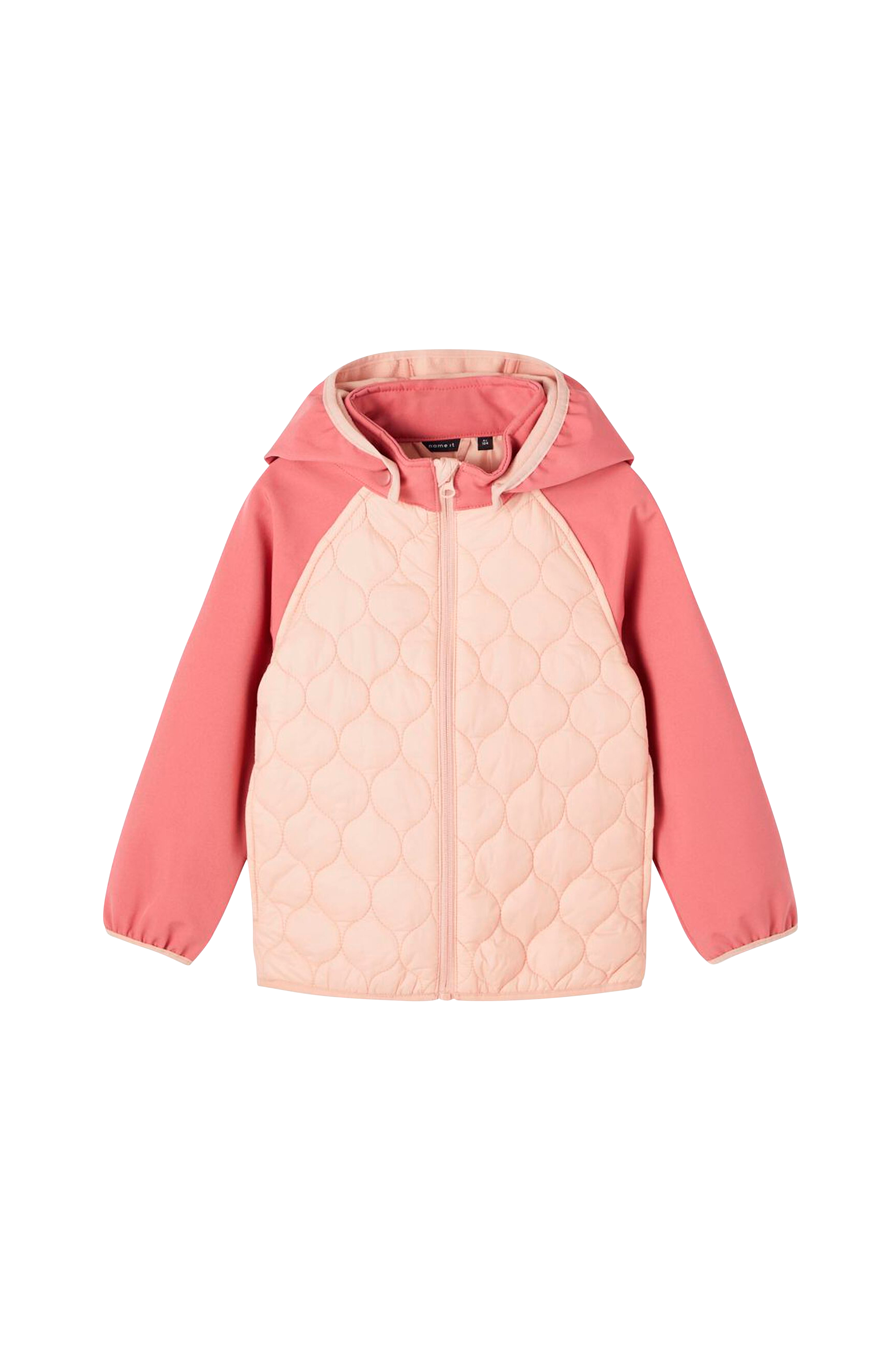 Tikattu takki, jossa ohut toppaus. Sileät hihat softshell-materiaalia, jossa pehmeää fleeceä sisäpuolella. Vetoketju edessä ja taskut sivusaumoissa. Irrotettava huppu.