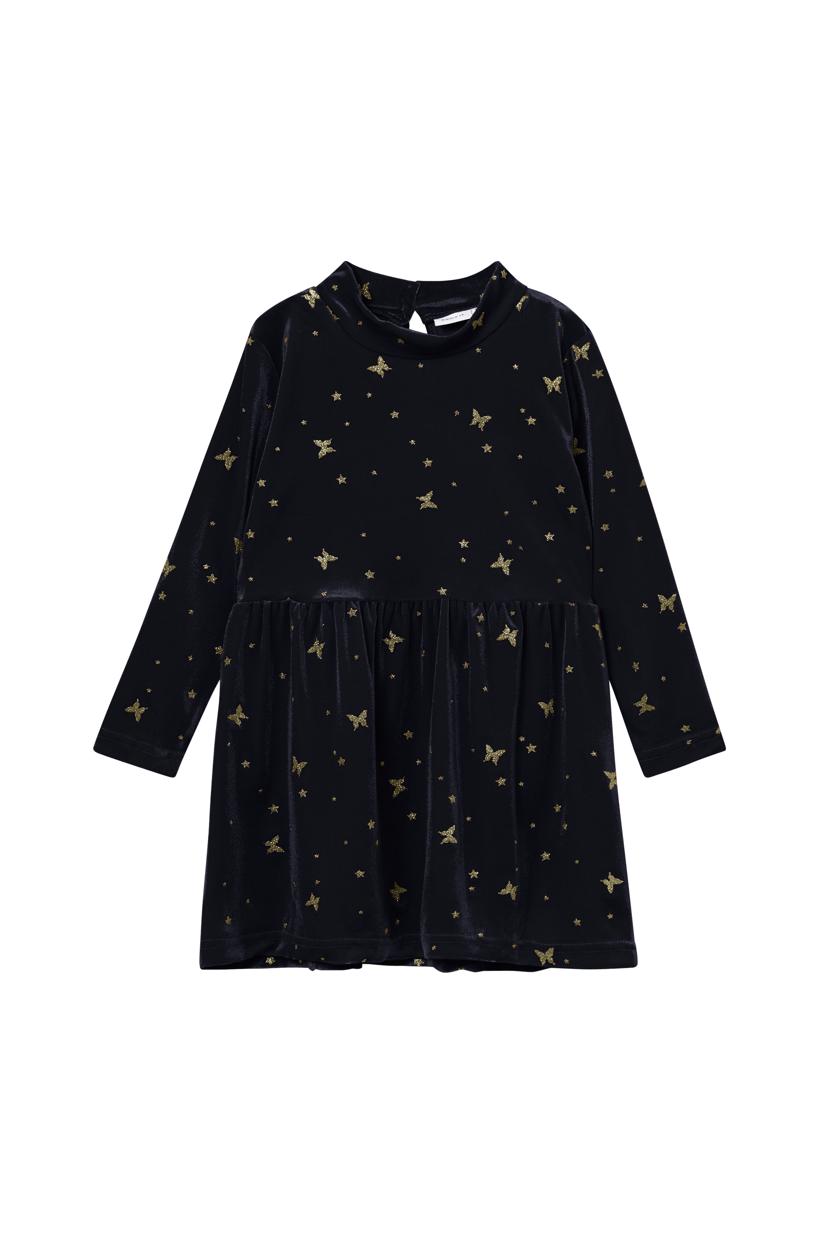 • Mekko veluurista kultakimaltavalla kuvioinnilla• Pitkät hihat• Korkea kaula-aukko• Halkio napeilla niskan kohdalla• Poimutettu vyötärö