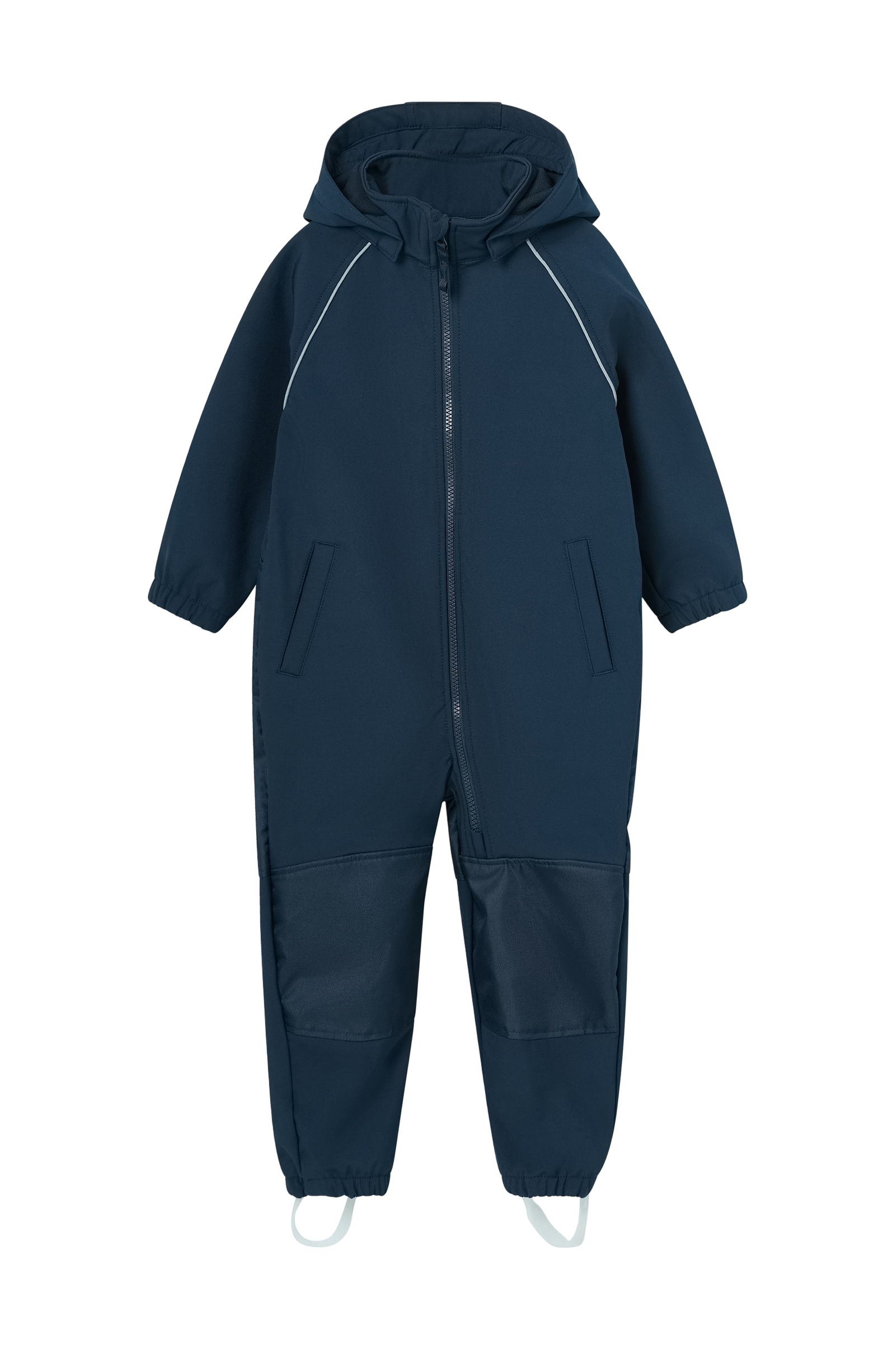 Irrotettava huppu. Vetoketju. Kuminauha hihansuissa ja lahkeensuissa. Irrotettavat, joustavat jalkalenkit. Heijastavat reunat edessä ja takana.
