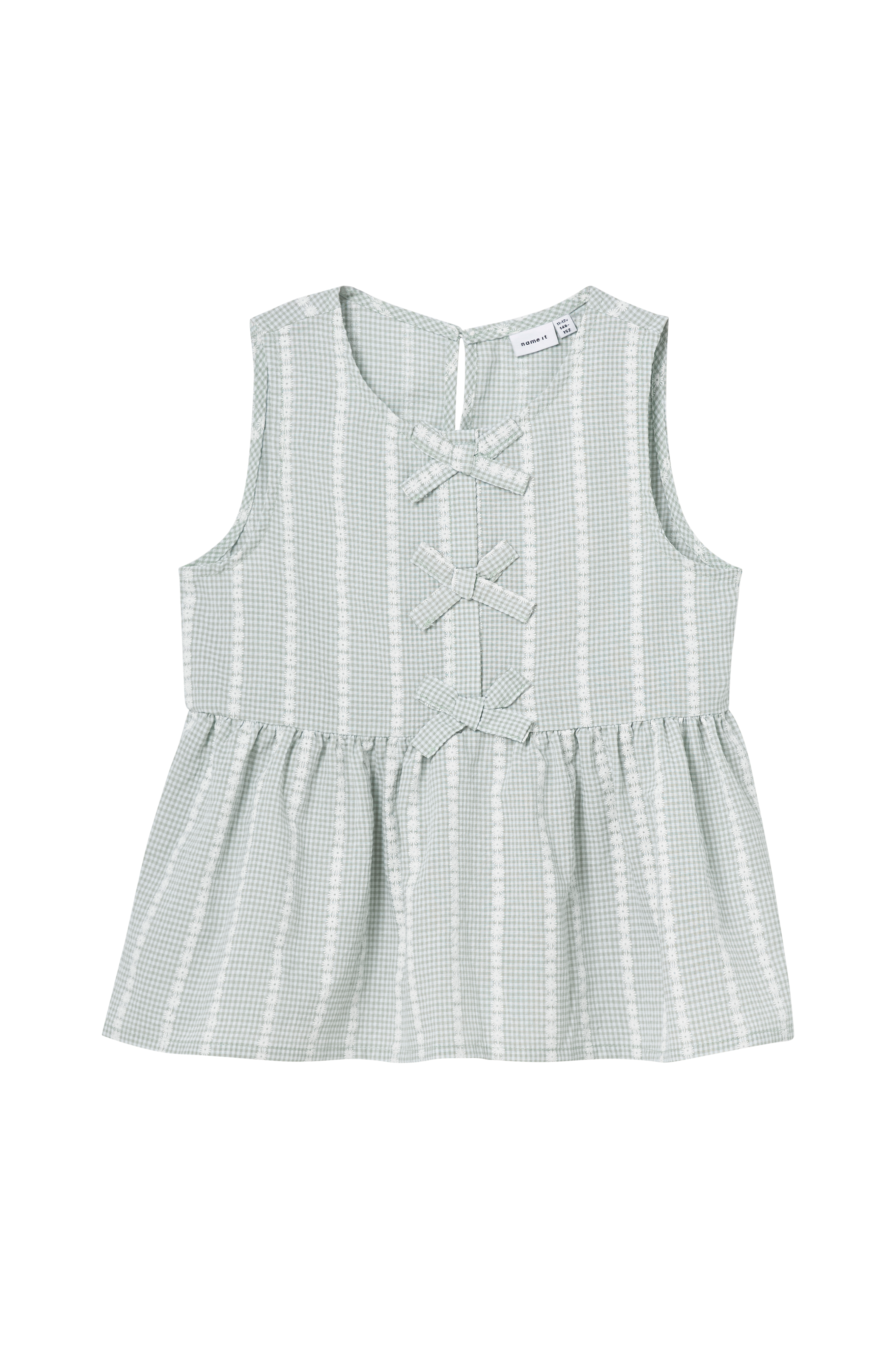 • Hihaton peplum-helma rypytyksellä vyötäröllä• Pyöreä pääntie napilla niskan kohdalla• Koristeelliset nauhat rinnassa
