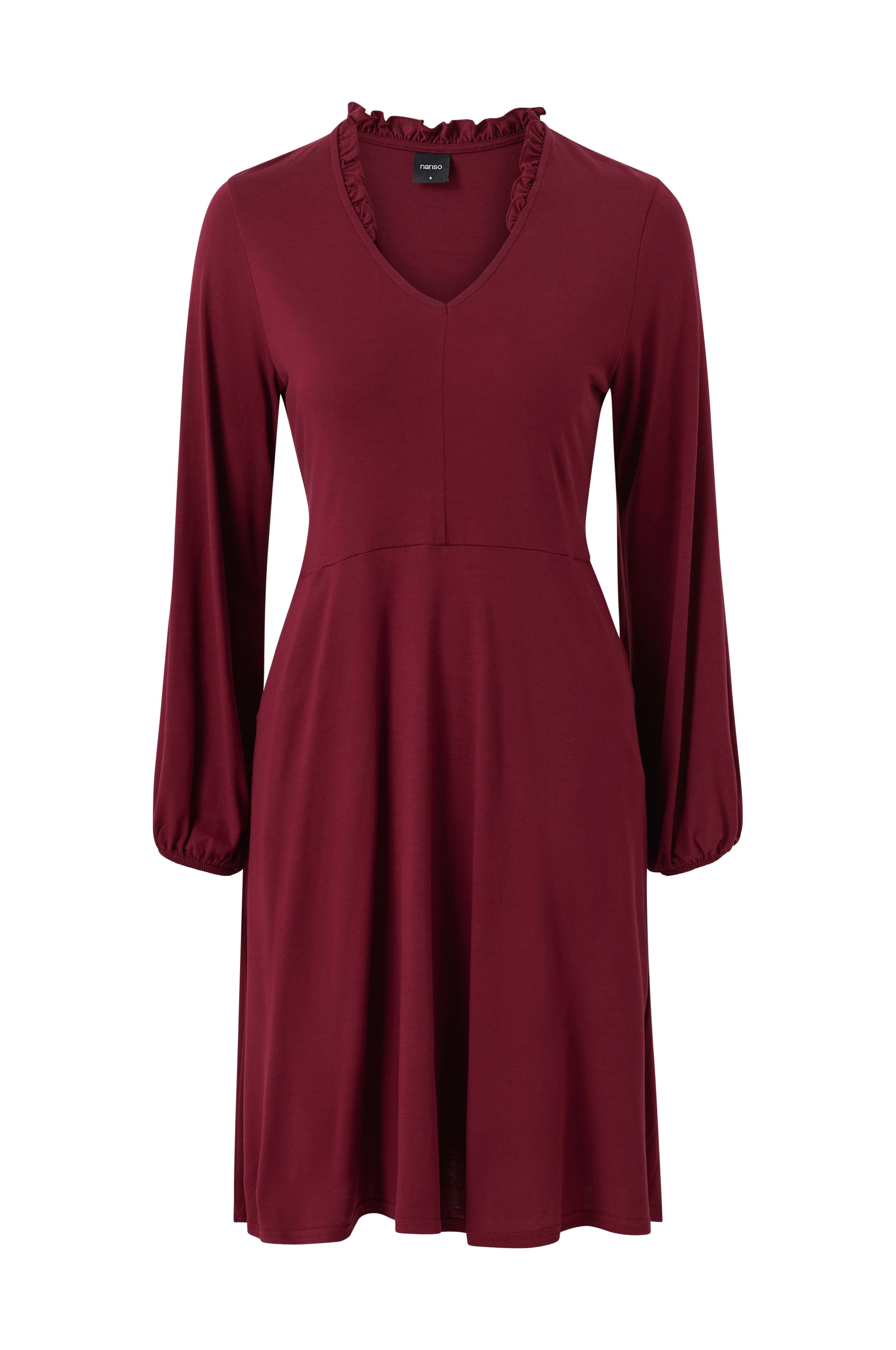 • Malli korostetulla vyötäröllä• V-muotoinen kaula pienellä röyhelöllä niskan kohdalla• Pitkä hiha joustavalla hihansuulla• Taskut edessä• Pituus: 101 cm koossa S