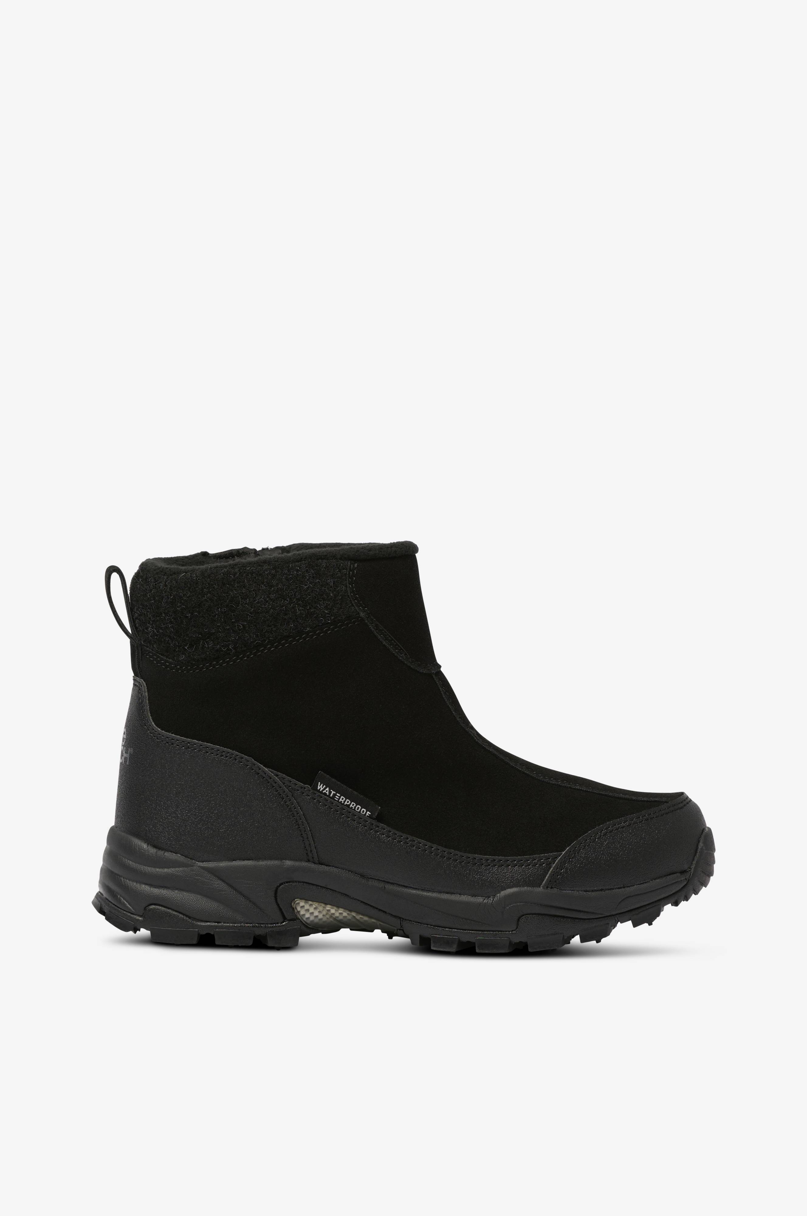Lämminvuoriset talvikengät kestävää mokkajäljitelmää, vahvikkeet nahkajäljitelmää. Vetoketju ja kangaskiila sivulla. Lämmin vuori pehmeää ja hengittävää fleeceä. Ulkopohjassa nastat muovia ja metallia, mikä takaa mahdollisimman hyvän pidon talvikeleillä. Vetolenkki takana. Varren korkeus n. 12 cm.