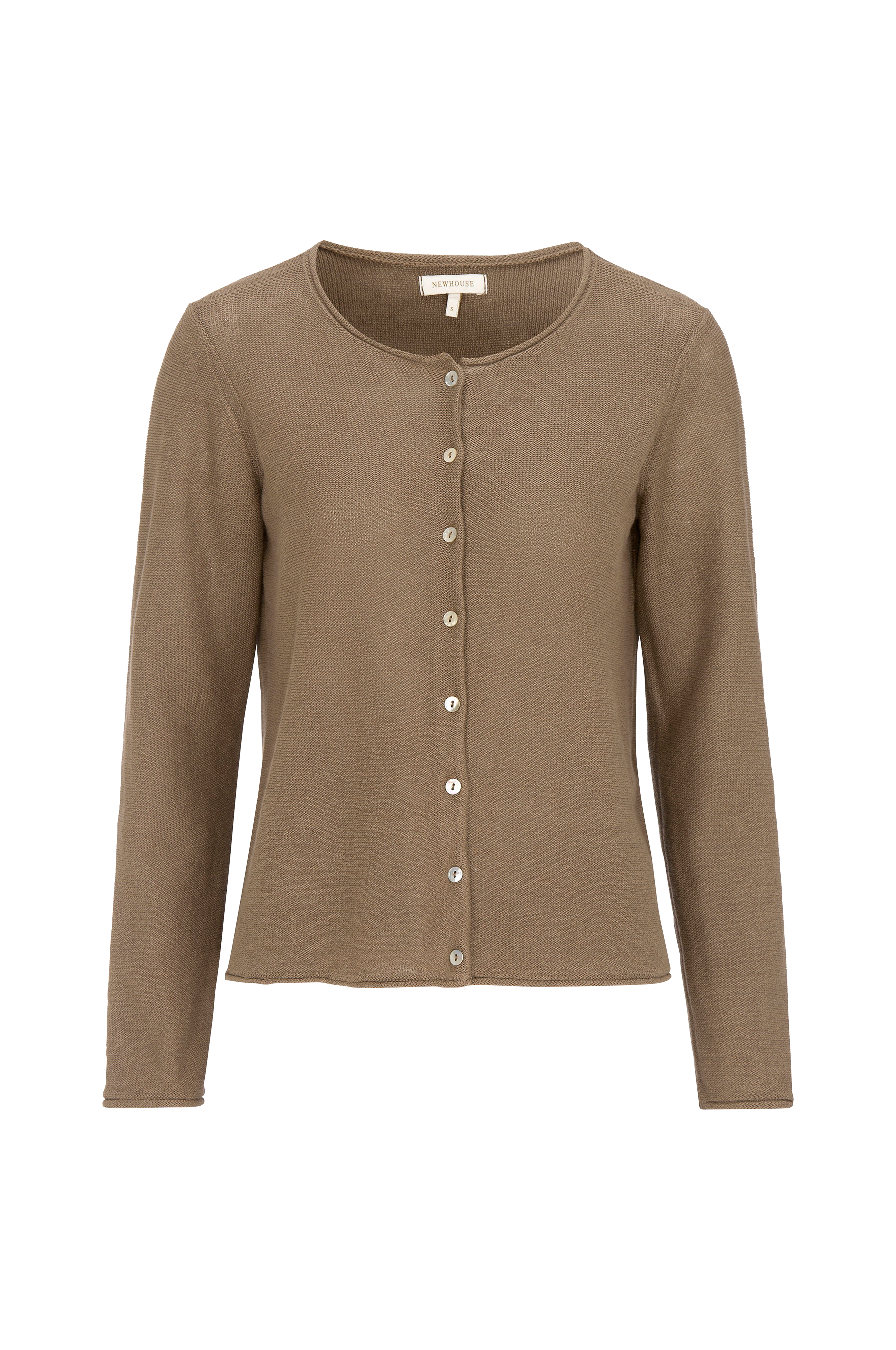 Käänteisneulottu neuletakki siistillä tyylillä. Rullatut hihansuut ja helma, suljetaan aidoilla helmiäisnapeilla.