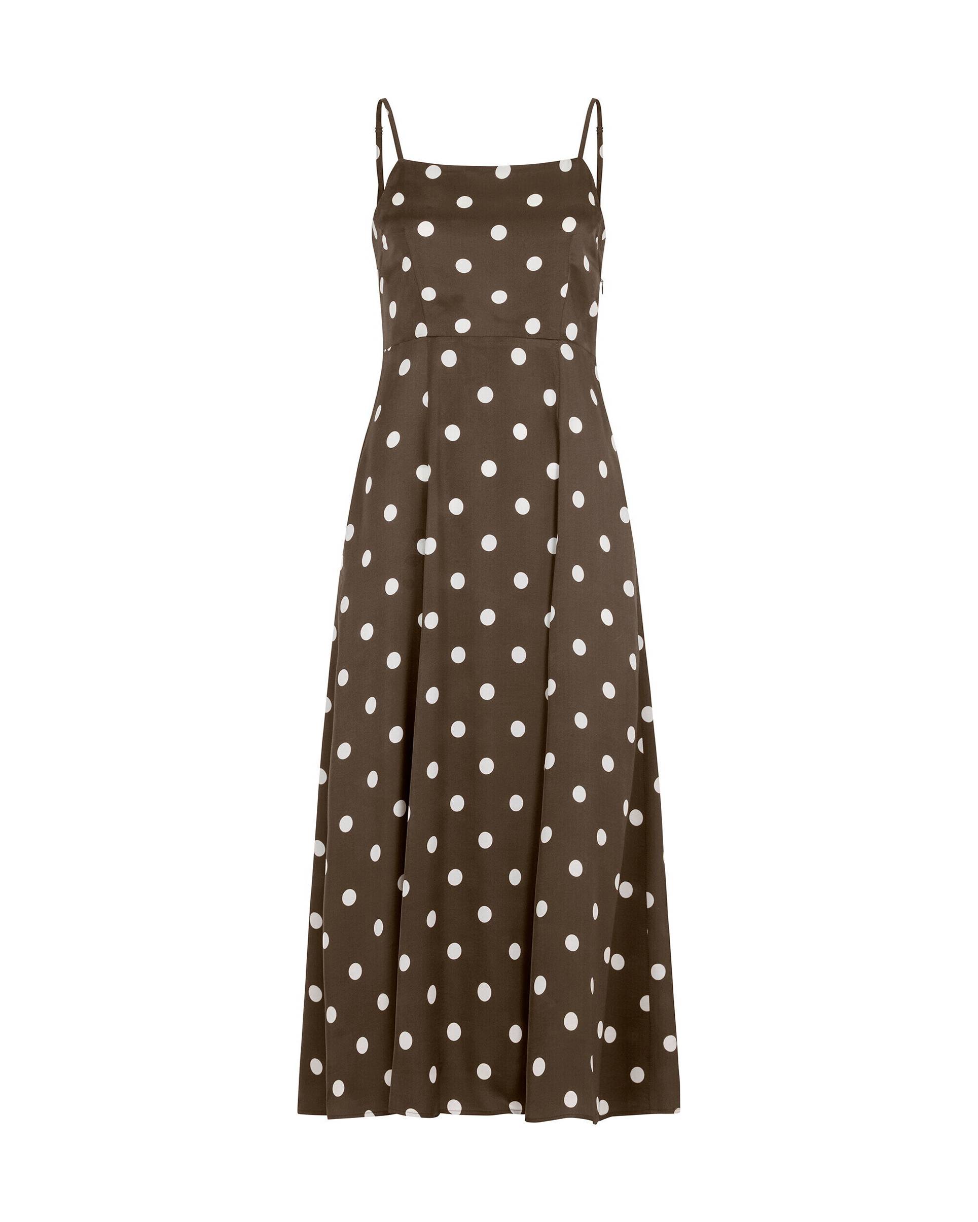 Nostalginen ja naisellinen mekko, jossa on istuva malli ja levenevä hame. Sivusaumataskut ja säädettävät olkaimet. Takana oleva smokattu yksityiskohta luo imartelevan istuvuuden. Mekko on osa newhouse-juhlavuoden mallistoa.