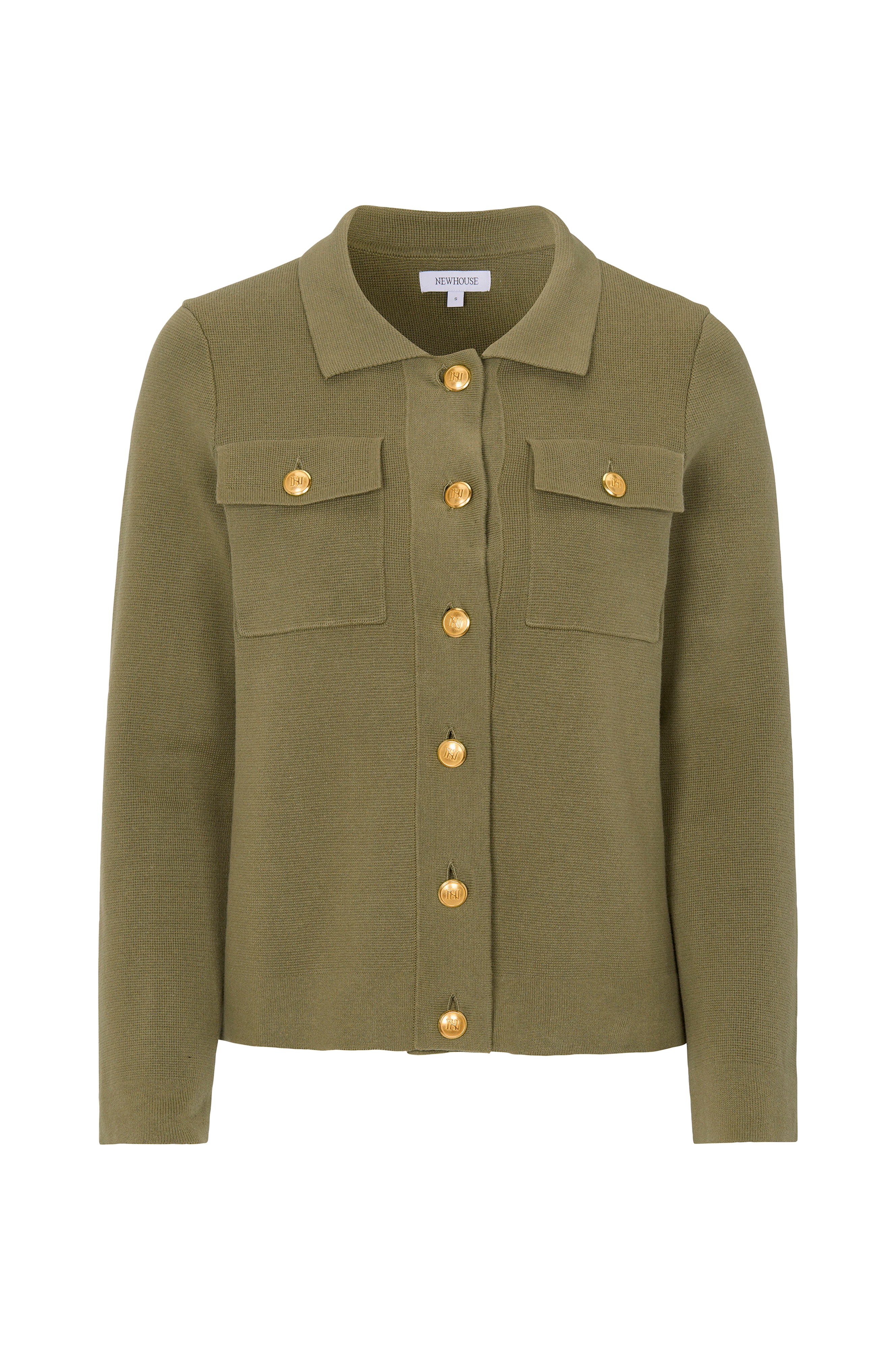 Milano takkityylinen neuletakki, jossa on rintataskut ja kullanväriset logonapit.
