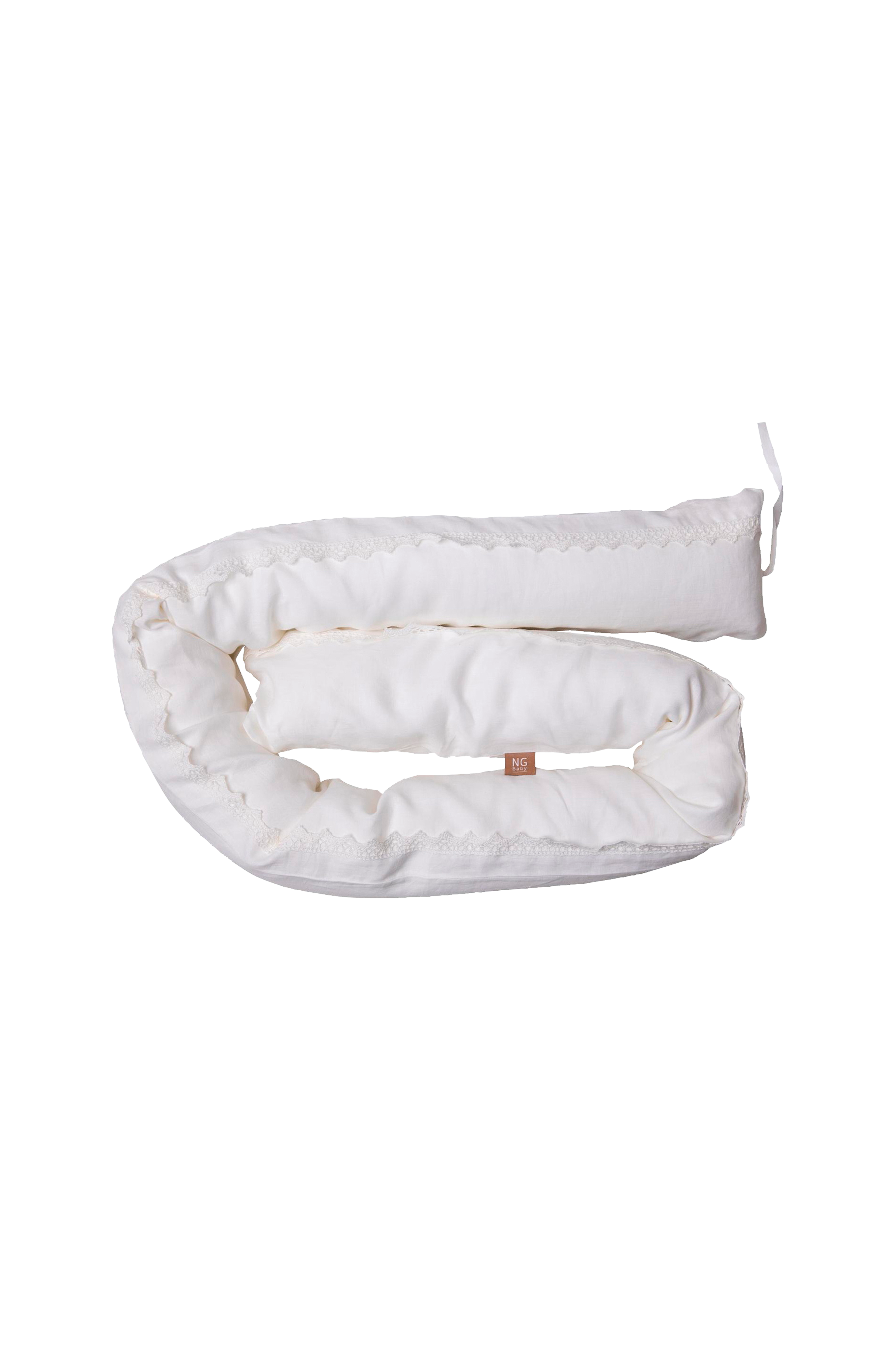 Valkoinen vartalotyyny, jossa pitsi luonnollista materiaalia