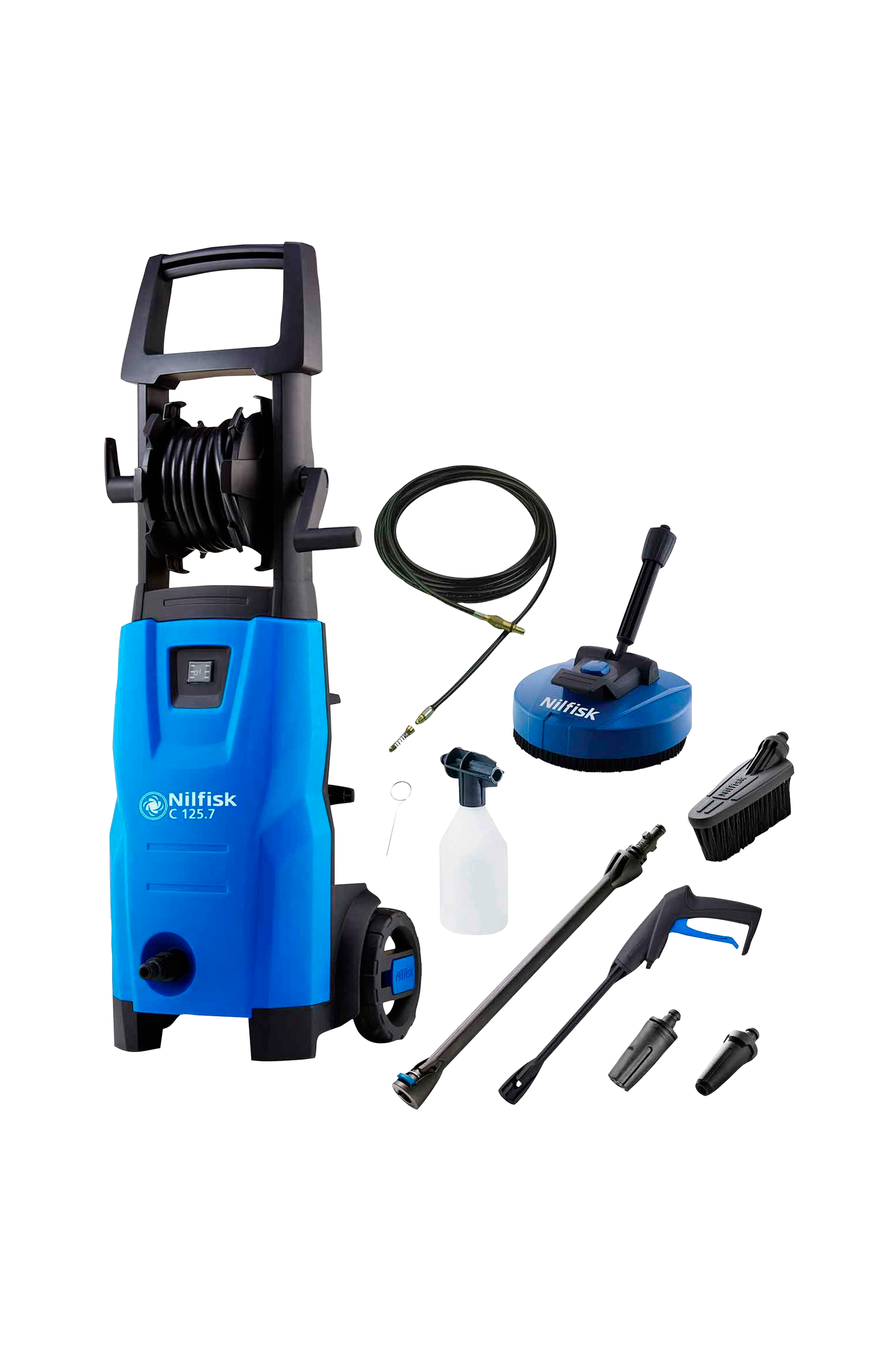 c125.7-6 on täysin varusteltu korkeapainepesuri, joka sopii erinomaisesti pieniin kotitaloustöihin. Sen mukana toimitetaan terassin puhdistuslaite, viemärin puhdistuslaite ja autoharja. Tässä pesurissa on 6 metrin letkukela, ja sillä voi hoitaa erilaisia kotitöitä. Siinä on kestävä metallipumppu, joka löytyy kaikista Nilfisk-painepesureista, paineensäädettävä tornadosuutin ja integroitu vaunu. Suihkukahvassa on pikaliitin ja kääntökahva. Säilytystilaa on suihkukahvalle, panssarille, suuttimille, vaahtotarvikkeille, letkulle ja virtajohdolle.