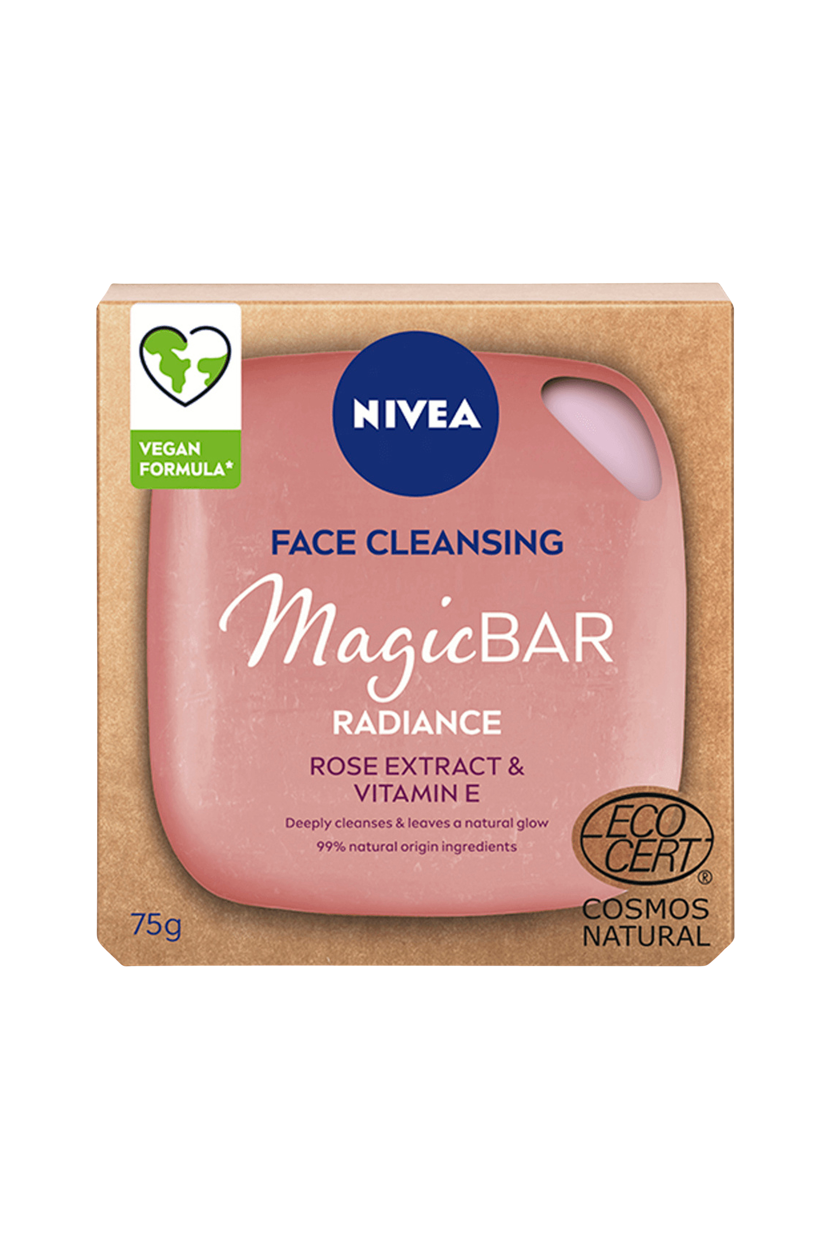 Nivea MagicBar Radiance Cleansing Bar on ruusu-uutetta ja E-vitamiinia sisältävä kasvojenpuhdistukseen tarkoitettu palasaippua, jolla on luonnollinen sertifiointi. Se sisältää 99 % luonnollisia ainesosia ja pakkaus on täysin muoviton. Se ei sisältää alkalista saippuaa ja on optimoitu ihon pH-tason mukaan. Puhdistaa ihon hellävaraisesti tehden siitä pehmeän. E-vitamiini vahvistaa ihon suojakerrosta jättäen ihon joustavaksi ja rauhoittaen sitä. MagicBar Radiance Cleansing Bar antaa luonnollista hohtoa ja heleyttä. Sopii kaikille ihotyypeille. Saippualla on Cosmos Standardin mukainen Ecosert Greenlifen Cosmos Natural -sertifiointi.