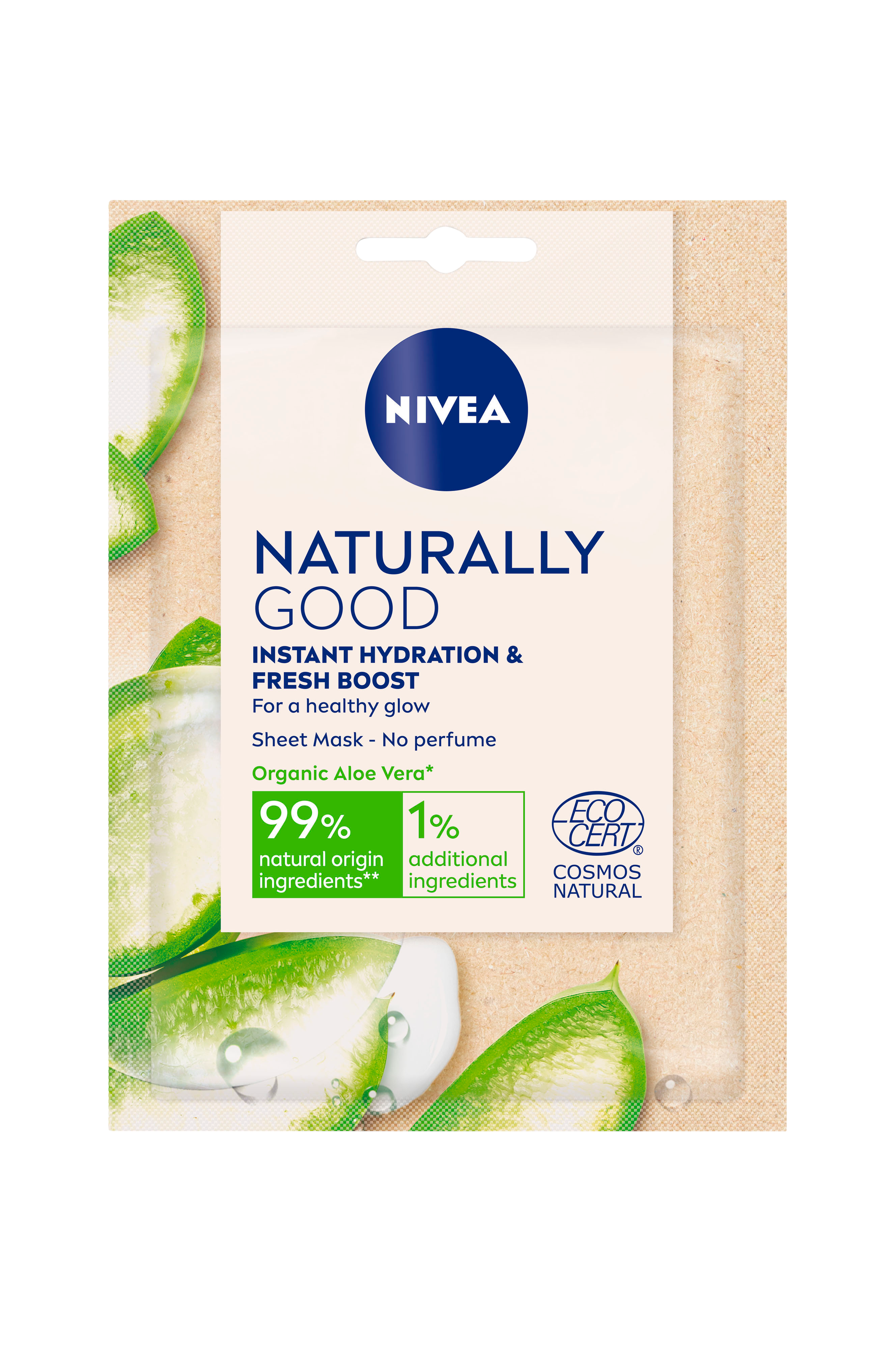 Nivea Natural Good Aloe Vera Sheet Mask -kasvonaamio sisältää ekologista aloe veraa, joka kosteuttaa ihoa välittömästi. Iho saa tehokkaan käsittelyn, tehokkaasti ravintoa sekä raikkaan hehkun 10 minuutissa. Luonnosta inspiraatiota saanut naamio tekee ihon pehmeäksi ja raikkaan tuntuiseksi. Sopii kaikille ihotyypeille.