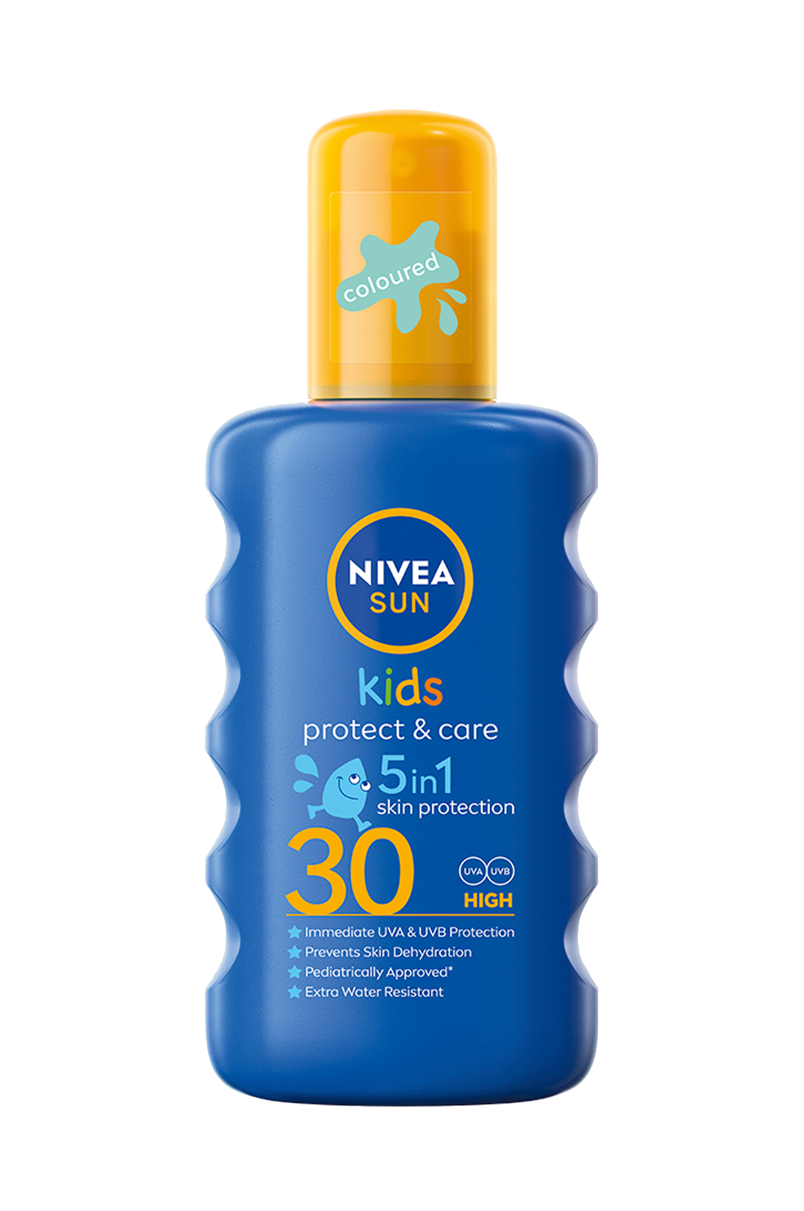 Lasten aurinkovoidesuihke, jossa suojakerroin - SPF 30. Suojaa ihoa sisä- ja ulkopuolelta.